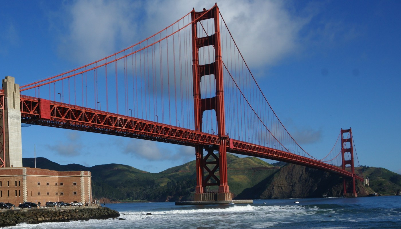 Wygnieceni i lekko zmarznięci budzimy się na widok wschodzącego słońca nad zatoką San Francisco. Niestety nie mieliśmy szczęścia podziwiać wschodu we mgle – tak bardzo znanego z widokówek miasta. Wcinamy po bananie i urządzamy sobie mały spacerek po moście. Z bliska wygląda imponująco, a kolor czerwonej farby znakomicie kontrastuje z błękitnym niebem i granatową wodą zatoki.