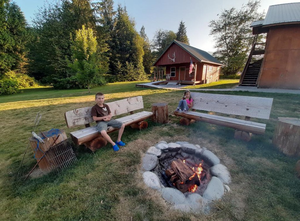 Wieczorkiem właściciel posesji rozpala nam ognisko w stylu amerykańskim ….czyli wlewa wiadro śmierdzącej podpałki do dołka 3 kawałkami drewna, i tak jak prawdziwy harcerz rozpala jedną zapałką 😊.