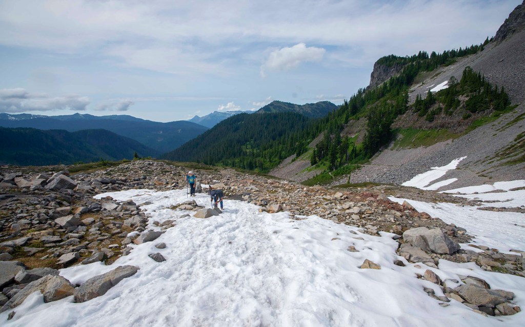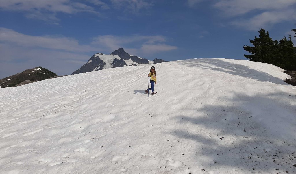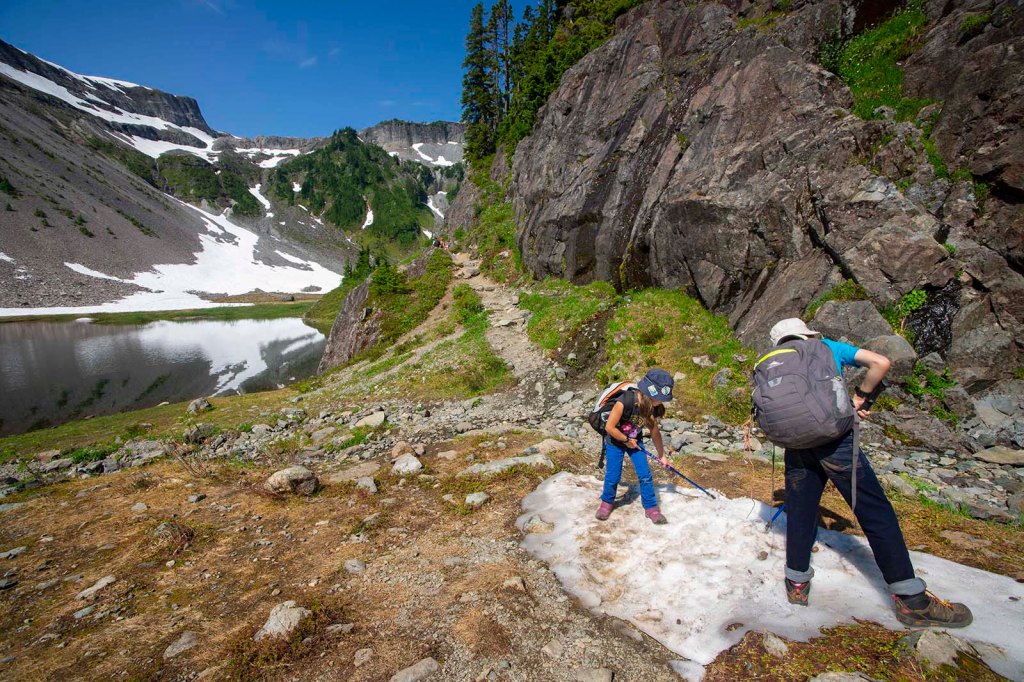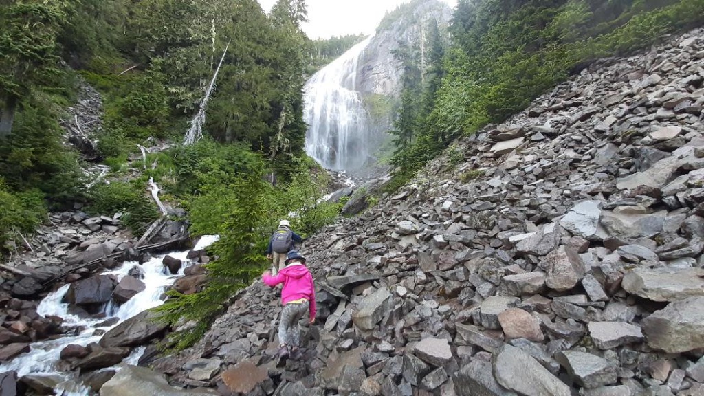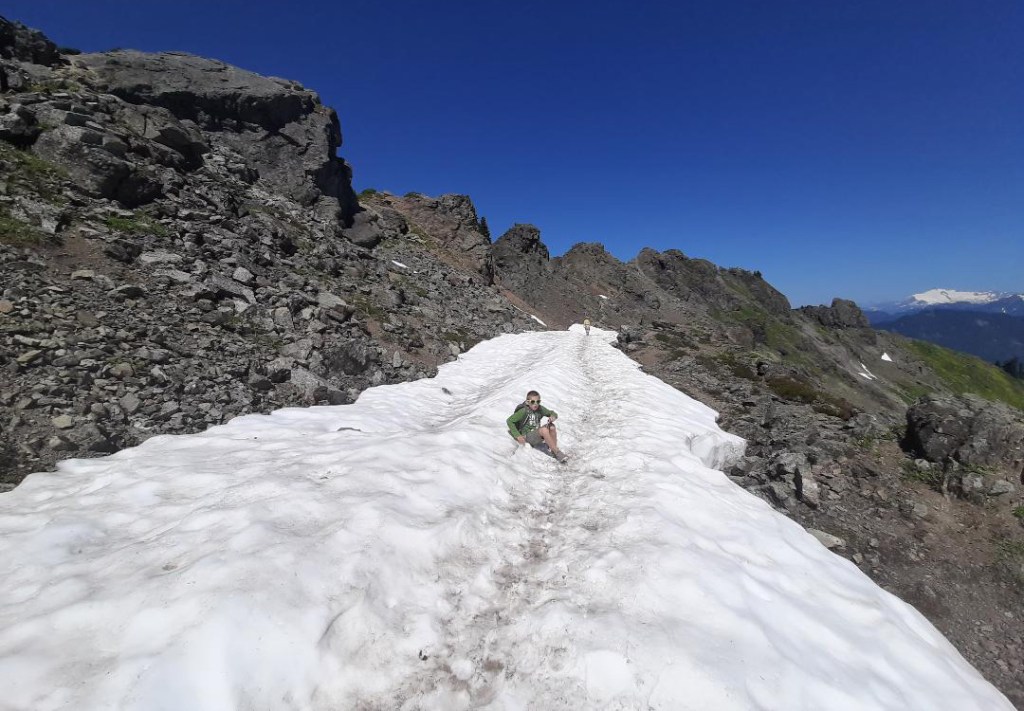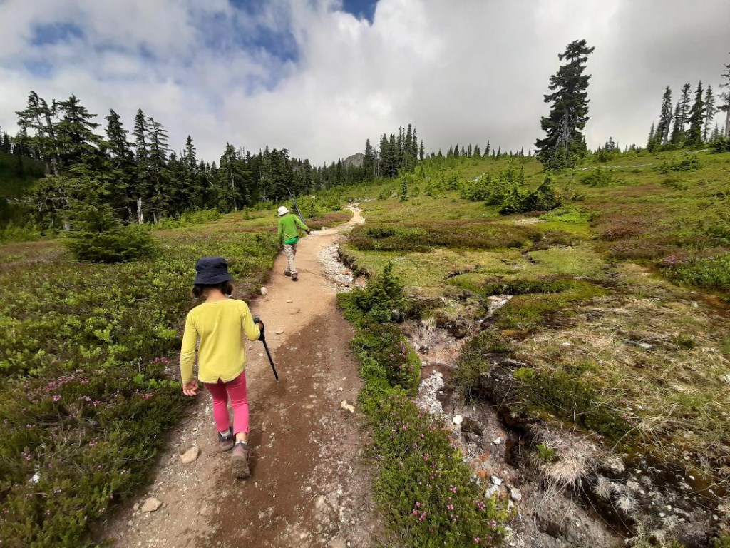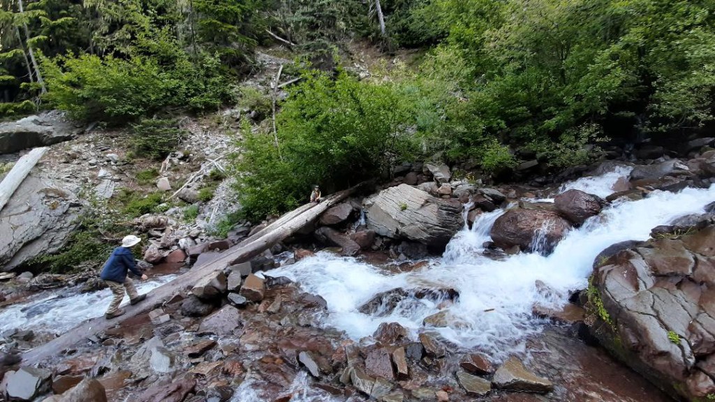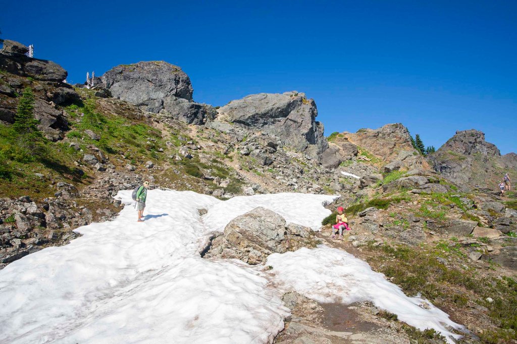 Paradoksalnie to zabrzmi, ale na prawdę jego widok warty jest każdego kroku …Pierwsza część szlaku około 1 mili prowadzi przez las, gdzie niestety komary dają trochę popalić. Polecam więc wrzucenie mocnego spreju do plecaka. W wielu miejscach porobione są tu drewniane kładki ułatwiające wędrówkę. Przed wędrówką trzeba też sprawdzić czy w górnych partiach nie zalega śnieg. Pomimo faktu, że przecież jest już sierpień mieliśmy do pokonania spore kawałki szlaku pokrytego zbrylonym wyślizganym śniegiem. Tu dzieciaki użyły „micro spikes” czyli mini-raków, co stanowiło dla nich po pierwsze wielką frajdę, a po drugie powód do dumy…. Zaraz po wyjściu z lasu zaczynamy przedzierać się przez bardzo wąską niekończącą się ścieżkę porośniętą (przerośniętym) pasternakiem krowim, wierzbówką i innnymi zaroślami sięgającymi ponad czubki naszych nosów.