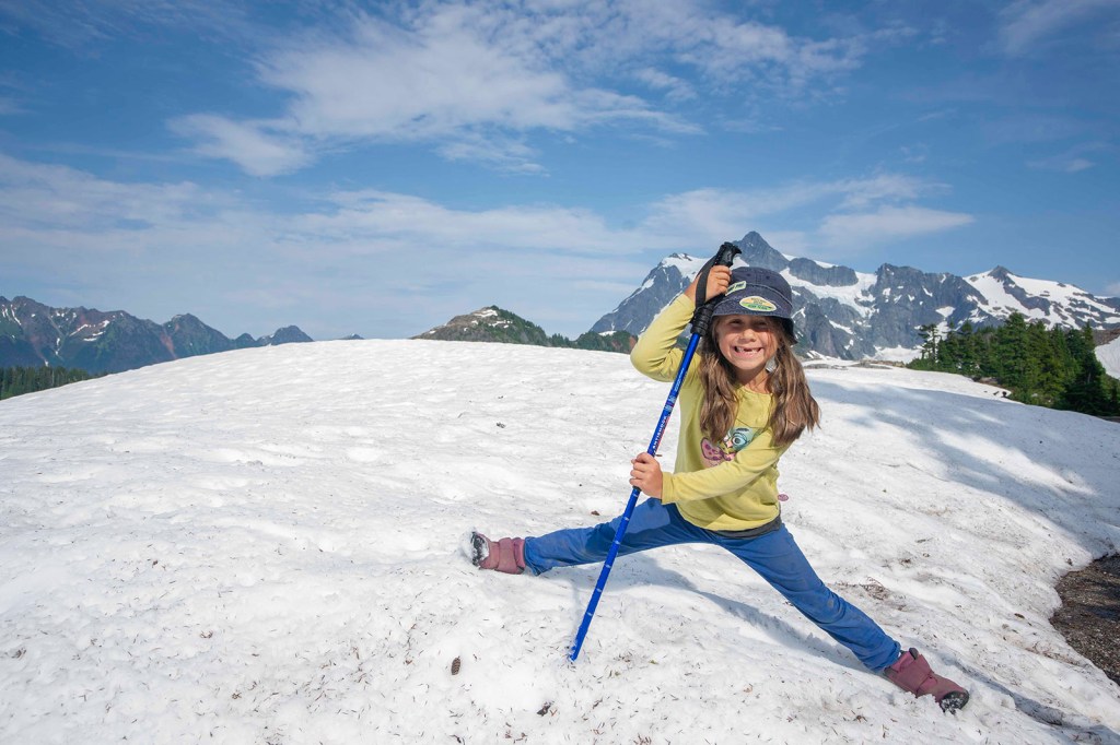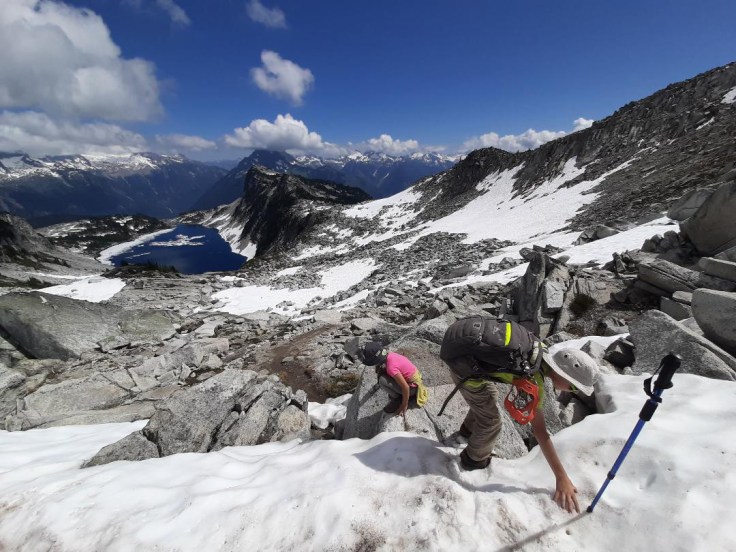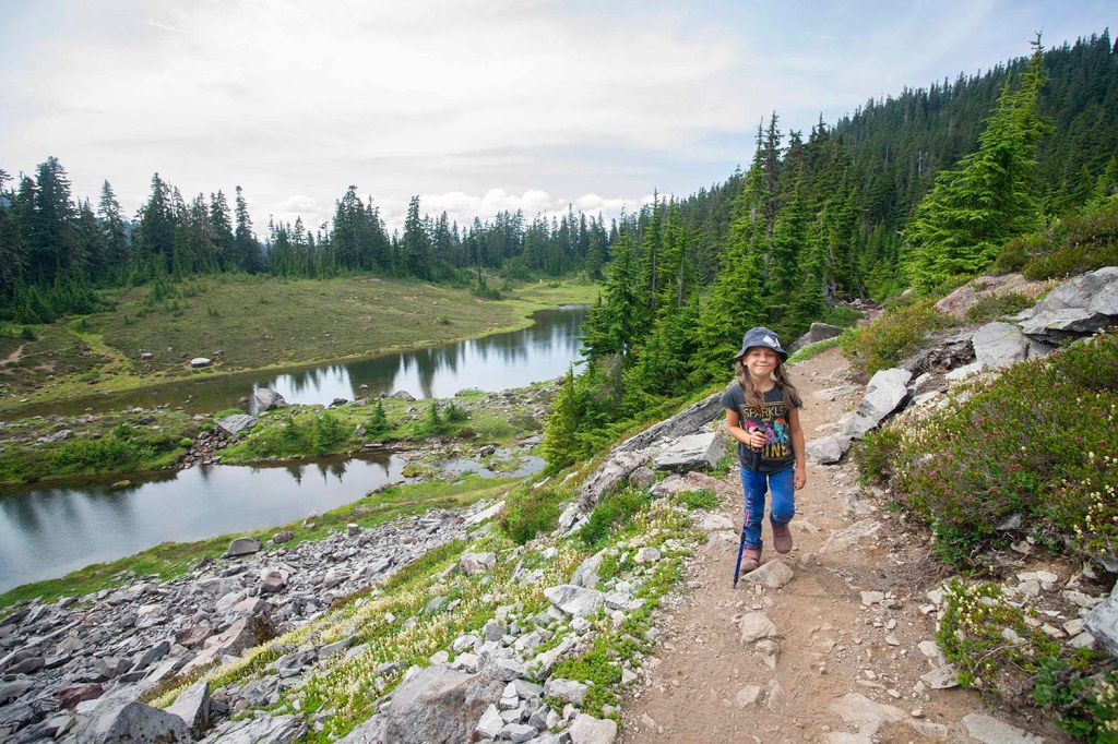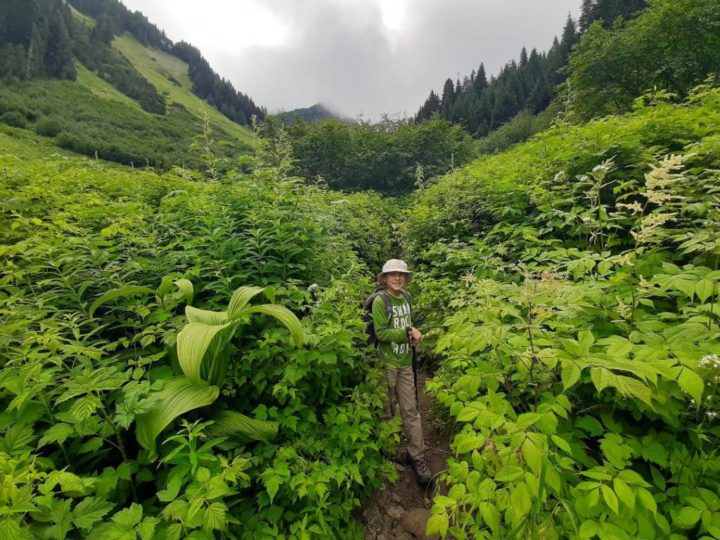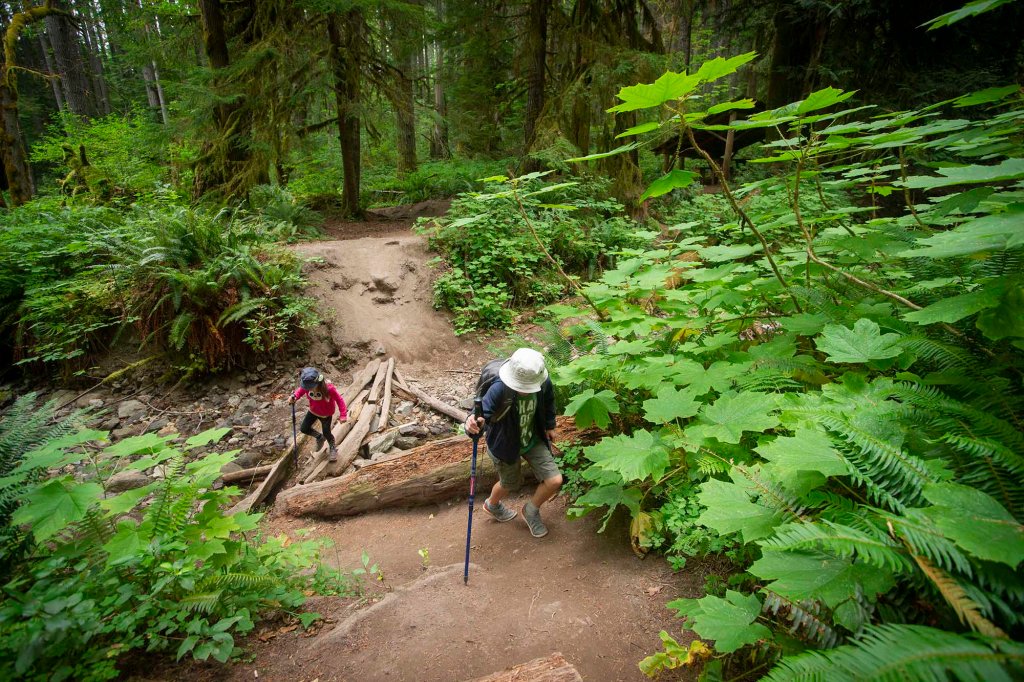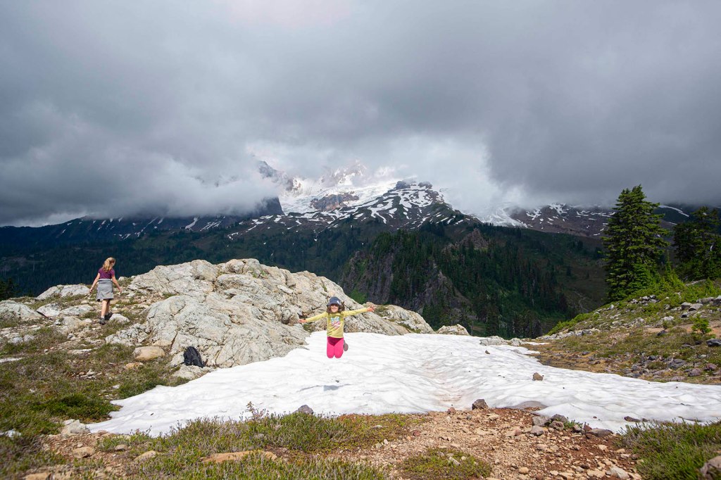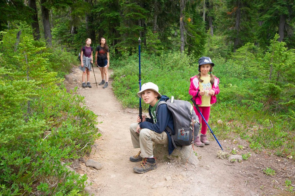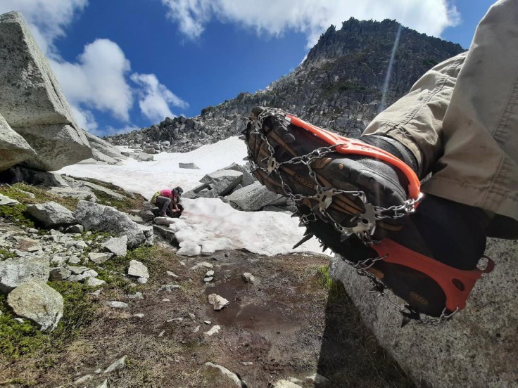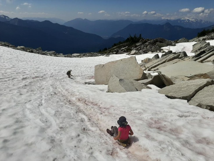 Paradoksalnie to zabrzmi, ale na prawdę jego widok warty jest każdego kroku …Pierwsza część szlaku około 1 mili prowadzi przez las, gdzie niestety komary dają trochę popalić. Polecam więc wrzucenie mocnego spreju do plecaka. W wielu miejscach porobione są tu drewniane kładki ułatwiające wędrówkę. Przed wędrówką trzeba też sprawdzić czy w górnych partiach nie zalega śnieg. Pomimo faktu, że przecież jest już sierpień mieliśmy do pokonania spore kawałki szlaku pokrytego zbrylonym wyślizganym śniegiem. Tu dzieciaki użyły „micro spikes” czyli mini-raków, co stanowiło dla nich po pierwsze wielką frajdę, a po drugie powód do dumy…. Zaraz po wyjściu z lasu zaczynamy przedzierać się przez bardzo wąską niekończącą się ścieżkę porośniętą (przerośniętym) pasternakiem krowim, wierzbówką i innnymi zaroślami sięgającymi ponad czubki naszych nosów.