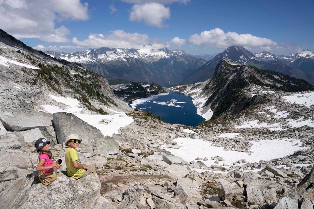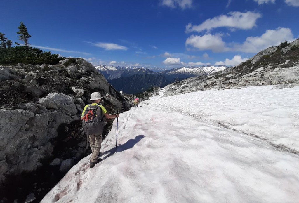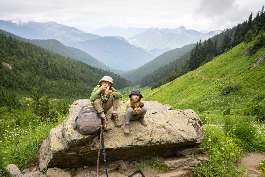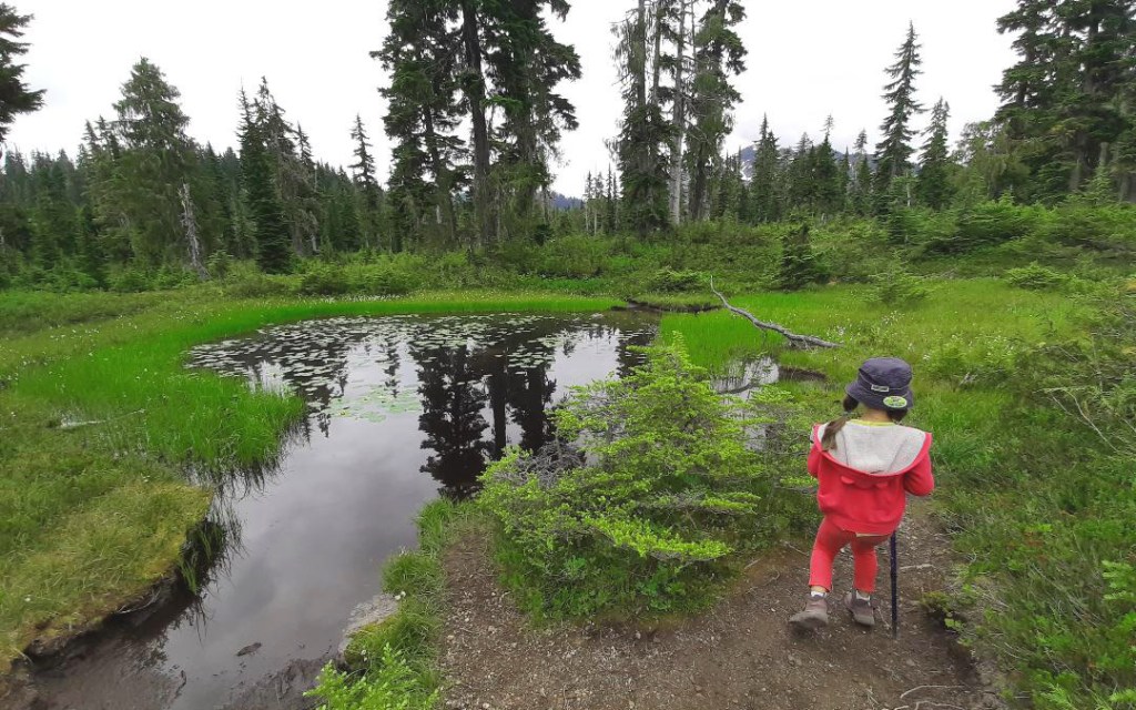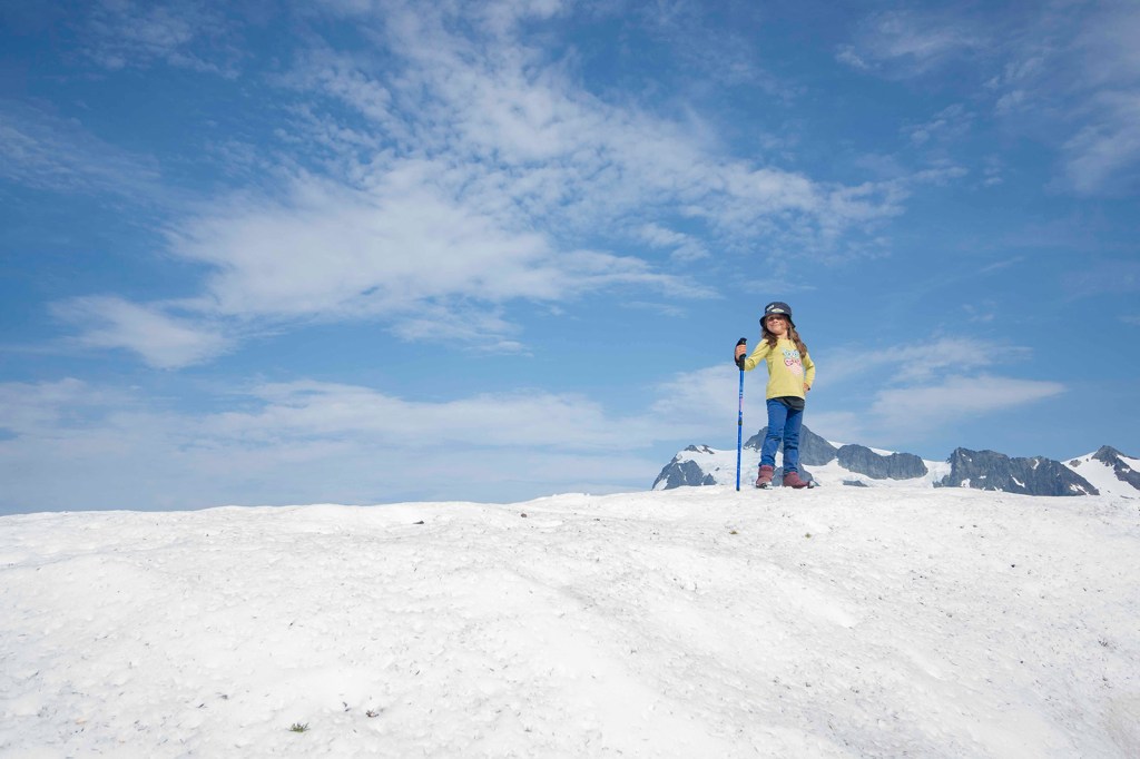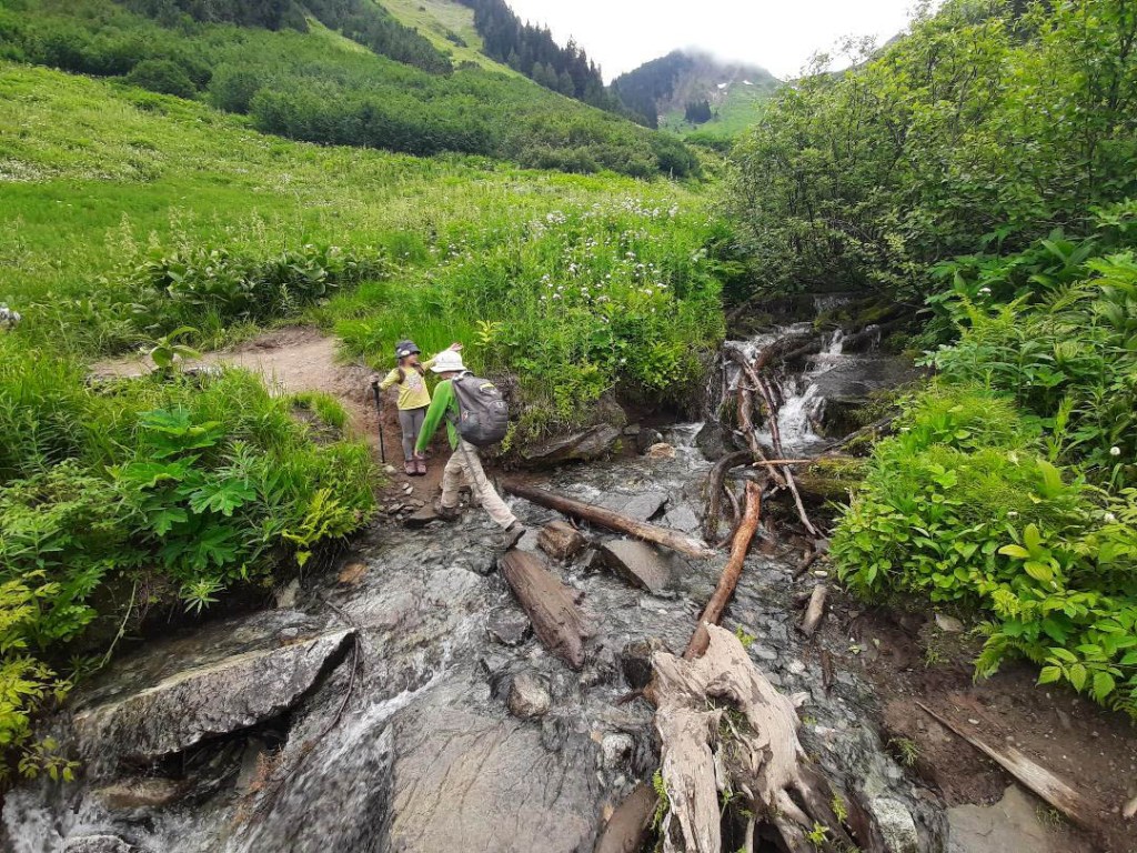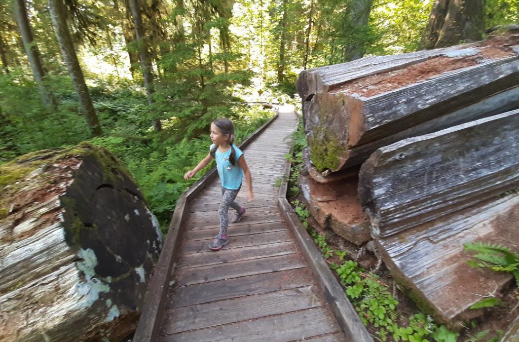 Paradoksalnie to zabrzmi, ale na prawdę jego widok warty jest każdego kroku …Pierwsza część szlaku około 1 mili prowadzi przez las, gdzie niestety komary dają trochę popalić. Polecam więc wrzucenie mocnego spreju do plecaka. W wielu miejscach porobione są tu drewniane kładki ułatwiające wędrówkę. Przed wędrówką trzeba też sprawdzić czy w górnych partiach nie zalega śnieg. Pomimo faktu, że przecież jest już sierpień mieliśmy do pokonania spore kawałki szlaku pokrytego zbrylonym wyślizganym śniegiem. Tu dzieciaki użyły „micro spikes” czyli mini-raków, co stanowiło dla nich po pierwsze wielką frajdę, a po drugie powód do dumy…. Zaraz po wyjściu z lasu zaczynamy przedzierać się przez bardzo wąską niekończącą się ścieżkę porośniętą (przerośniętym) pasternakiem krowim, wierzbówką i innnymi zaroślami sięgającymi ponad czubki naszych nosów.