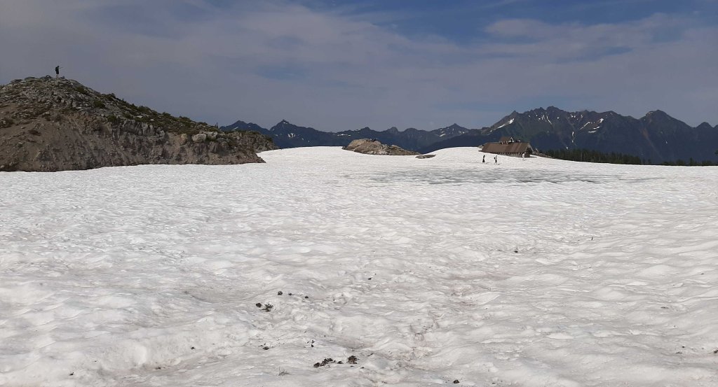 Tu już zataczmy się z wycieńczenia….. Kondycja widać typowo plażowa….. 😊. Dookoła nas skaczą chipmanki i słyszymy charakterystyczne nawoływania świstaków, których jednak nie udaje się nam wypatrzeć pomiędzy skałami. Po tej stronie gór jest znacznie więcej kolorowych kwiatów, które upiększają widoki. Po lewej stronie otaczamy Mt. Table. Z tyłu zostaje Mt. Baker i w oddali przed nami widać już Mt. Shuksan.