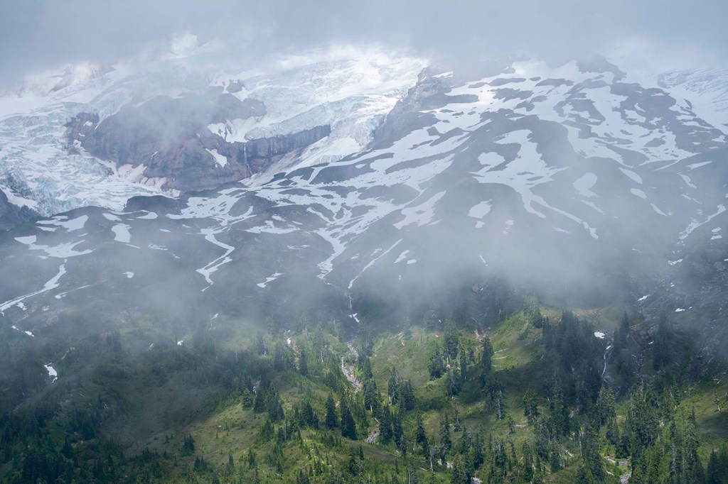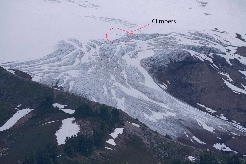 W oddali dostrzegamy wędrujących po lodowcu Kautz wspinaczy.……Jeśli planujemy wspinaczkę na Mt. Rainier musimy zaopatrzyć się w climbing permit i zapłacić climbing cost recovery Fee ($51). Jeśli chcemy skorzystać z komercyjmej wyprawy w zdobyciu szczytu, za 6 dniową techniczną wyprawę (południową stroną – Kautz Route) z przewodnikiem zapłacimy $2,447 od osoby. Opcja 4 dniowa klasyczną (najłatwiejszą) drogą to koszt $1,222 za osobę.