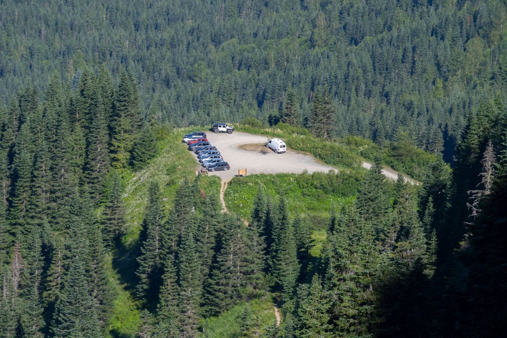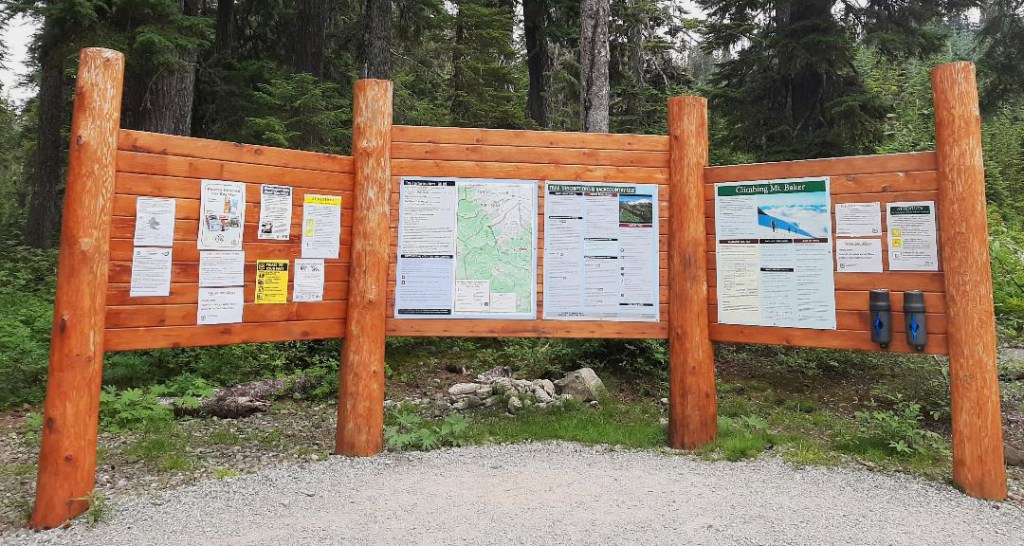 W powiększonym 5 osobowym składzie wyruszamy o poranku na szlak Park Butte. Dojazd do szlaku nie należy do najprzyjemniejszych – droga numer 12, a następnie 13 jest szutrowa i pełna dziur, także średnia prędkość jaką rozwijamy to około 5 mil na godzinę. Sam dojazd do wyjścia na szlak zajmuje nam ponad godzinę. Poza tym GPS źle nas kieruje, chcąc wyprowadzić w przysłowiowe pole. Po zjechaniu z głównej drogi Baker lake Road w lewo, ani jedna z szutrowych dróg nie jest w żaden sposób oznaczona więc niezastąpioną pomoc niesie oczywiście mapa topograficzna. Po wjechaniu na FR 12 jedziemy 3,7 mili i następnie skręcamy w FR 13 w prawo i jedziemy kolejne 5.3 mili. Parking jest całkiem spory, na około 40 aut i już pomimo tak wczesnej pory w około 25 % zajęty. Przed wejściem na szlak można wyczytać dużo informacji i na wielkich drewnianych tablicach zamieszczone są mapy terenu.