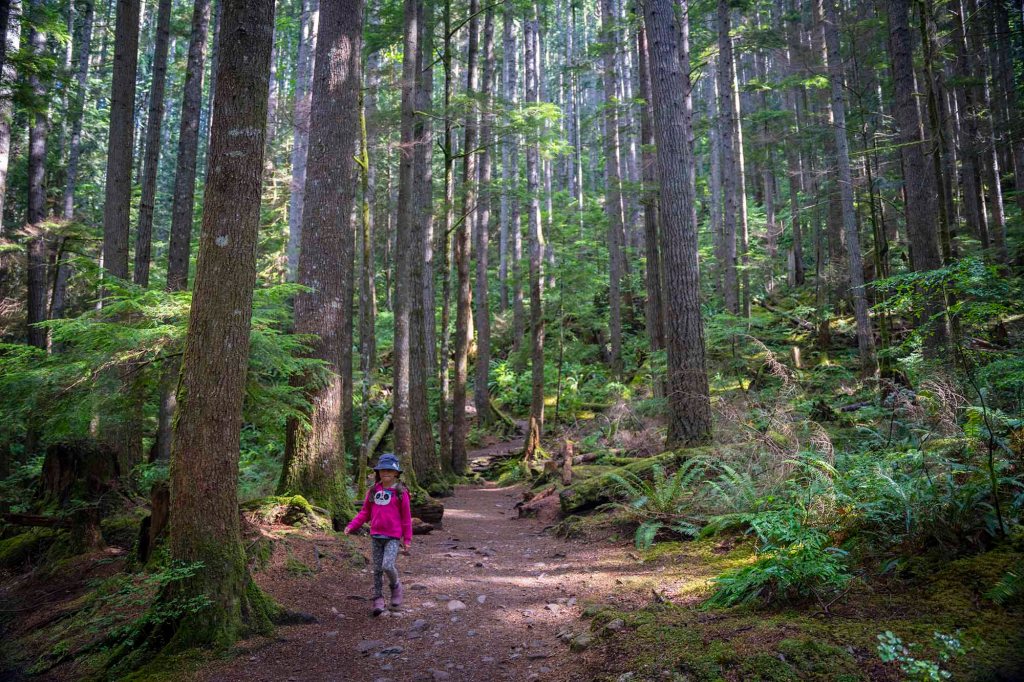 i jedziemy w kierunku jeziora Baker, żeby trochę się schłodzić po trudach szlaku. Patrząc do góry już z głównej drogi (nr 20) – góra Sauk wydaje się wręcz nie do zdobycia! Wow! Jeszcze przed dotarciem na plażę przebiegamy tylko półmilową scieżkę Shadow of the Sentinel Trail, meandrują pomiędzy wielkimi kilkusetletnimi drzewami Douglas-fir (daglezja zielona) i Western red cedars (żywotnik olbrzymi).
