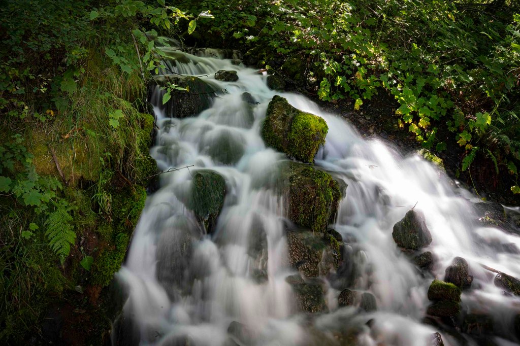 Wzdłuż jeziora spacerujemy asfaltową drogą mijając mały wodospad, który poza widokiem na jezioro i wystające z niego konary zatopionych drzew, jest jedyną atrakcją tego miejsca.