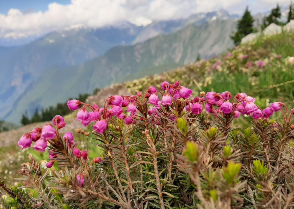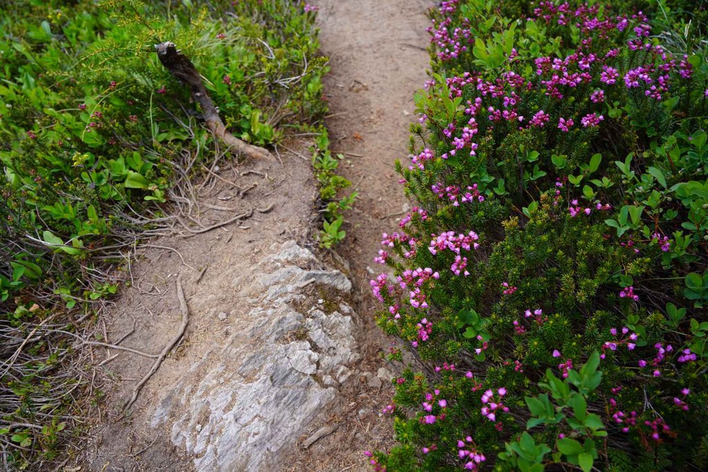 Idziemy w kierunku przeciwnym do kierunku wskazówek zegara, co jest według porad innych hikerów najlepszym rozwiązaniem. Pięknie kwitnące na różowo wrzosy po obu stronach naszej ścieżki cudownie kontrastują z krajobrazem górskim.