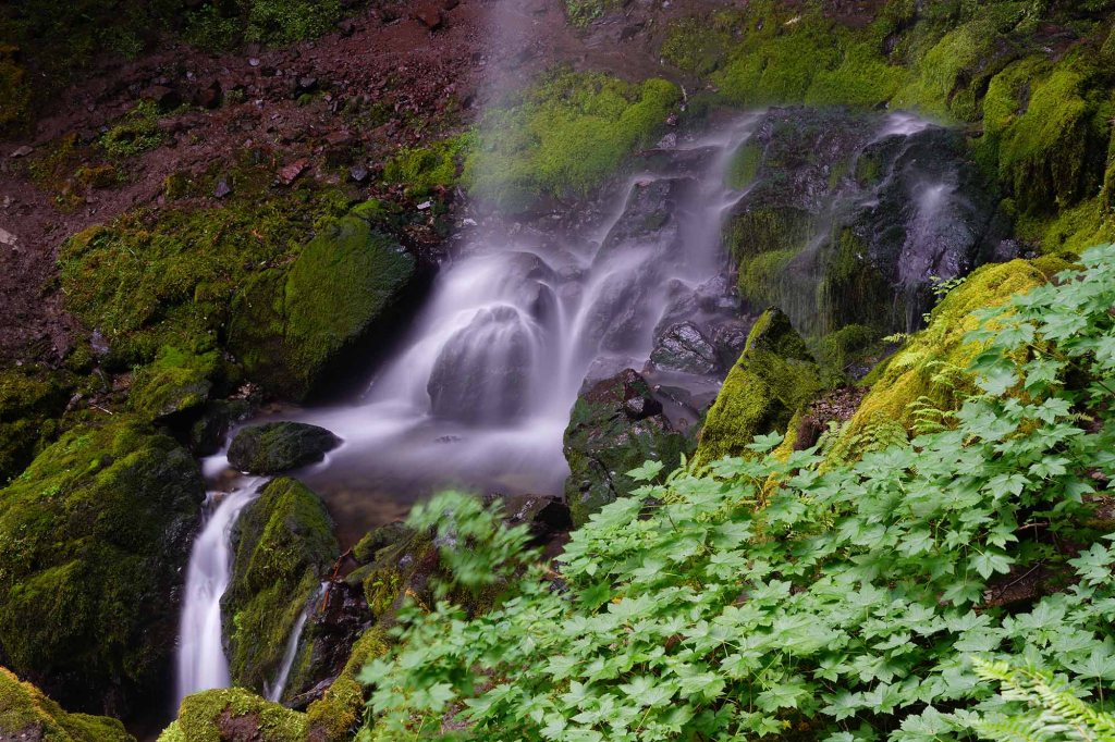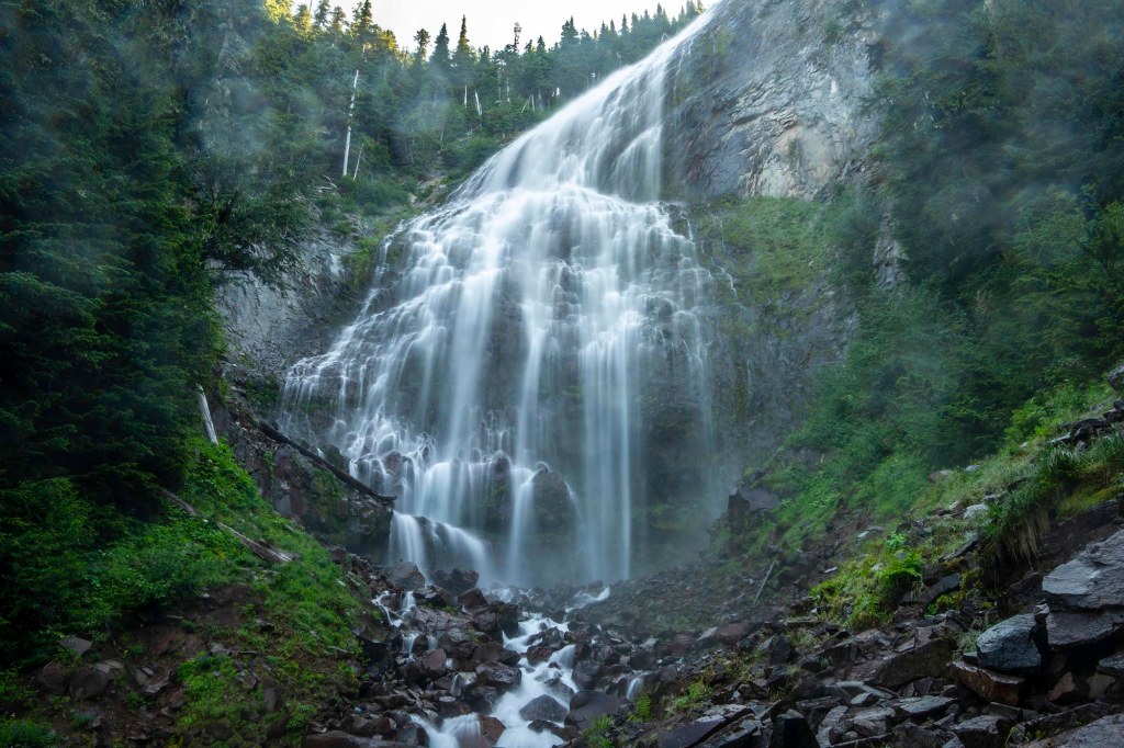 Można tu jechać swobodnie 25 mil/h. Dojeżdżamy do końca drogi, gdzie znajduje się bezpłatny kemping nad Mowich lake. (Ponieważ jesteśmy na terenie parku narodowego trzeba albo wykupić bilet za $30, albo posiadać National Park Pass). Mamy tu do przejścia 2 szlaki – Spray falls trail i Tolmie Peak, obydwa wychodzą z parkingu przy kempingu. Pierwsze kroki kierujemy na Spray Falls trail (część szlaku Spray Park Trail)(długość 4 mile), co okazuje się jednak nie za dobrą decyzją.