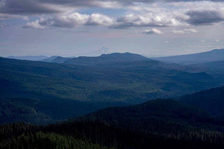 Patrząc na południe (już po Oregońskiej stronie)…..w oddali połyskuje pionowy stożek Mt Hood (3,429 m n.p.m). Na północy najwspaniajsza z gór Wasingtonu – Mt. Rainier (4,392 m. n.p.m)……