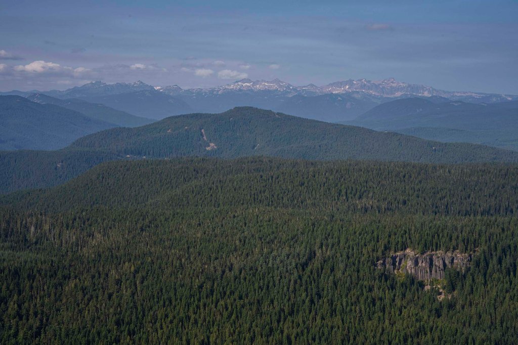Na północy obok Bakera – Black Buttes, Lincoln i Colfax w szaroburych chmurach, południowy zachód to Twin Sisters i dolina rzeki Nooksack.
