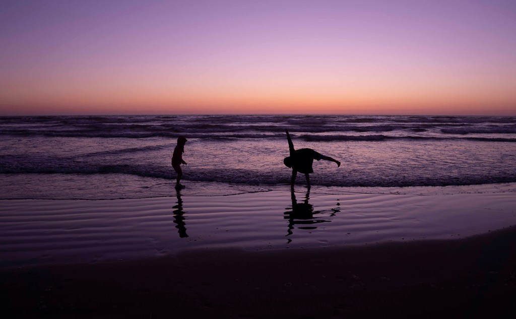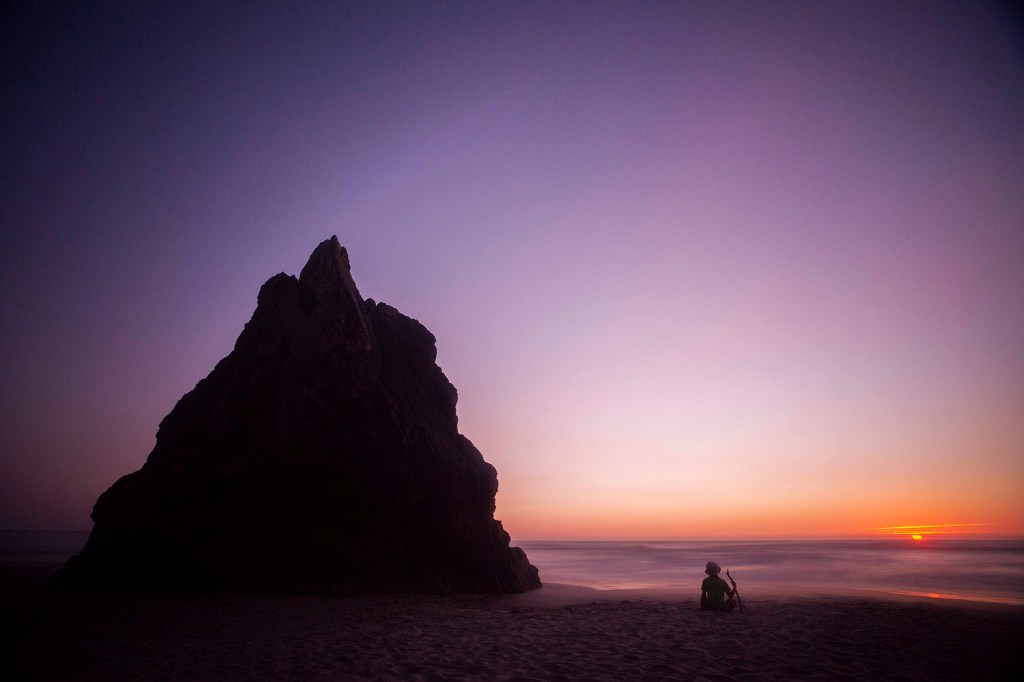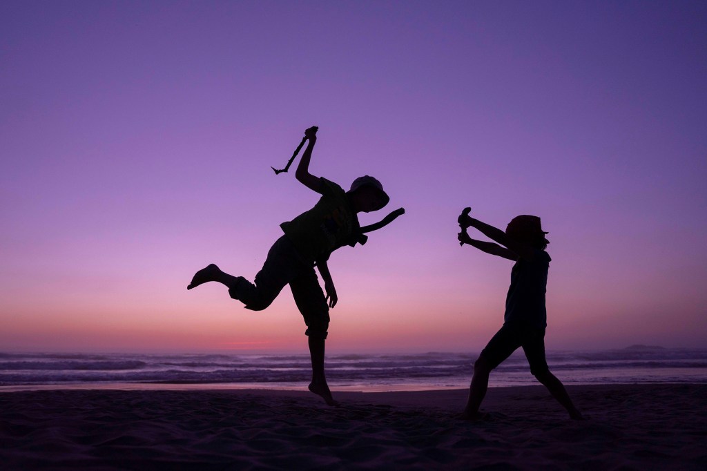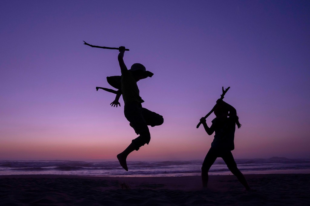 Cudowna odświeżająca bryza i światło wschodzącego słońca daje nam wiele radości – chociaż dzieci bardziej interesuje robienie szałasu z patyków niż idylliczny obraz oceanu i skał.