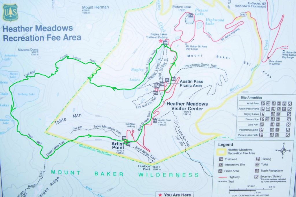 Zaczynamy jak zawsze o świcie naszą wielką przygodę ze stanem Washington. Droga Mount Baker scenic byway (#542) jest na szczęście otwarta (chciaż nie do samego końca, ze względu na olbrzymie połacia śniegu zalegające w najwyżej położonej jej części). Dojeżdżamy do parkingu przy Heather Meadows Base Area (zamiast Heather Meadows Visitor Center). Przy drodze widoczny jest znak informujący, że droga jest zamknięta za 0.7 mili. Nie przyszło mi jakoś wtedy do głowy, żeby podjechać dalej przez co dodaliśmy sobie ponad 1.5 mili pieszej wędrówki….. Byliśmy tak zaoferowani widokami dookoła, że poprostu zaparkowaliśmy na pierwszym możliwym miejscu, spakowaliśmy manatki – (jak się później okaże zbyt duże) i ruszyliśmy z kopyta na pętelkę Chain Lakes.