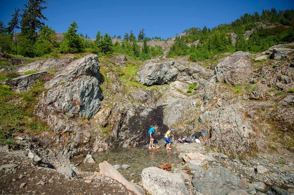 Ponieważ jest to nasz pierwszy poważny szlak w tym sezonie wakacyjnym tuż po przejściu półmilowego kawałka dzieciaki rządają postoju i sporej dawki słodyczy, włączając przy tym powoli tryb marudzenia. Po przejściu kolejnego skrawka trasy urządzamy sobie kolejny postój nad małym wodospadem, połączony z wymaczaniem nóg w lodowatej wodzie strumienia……