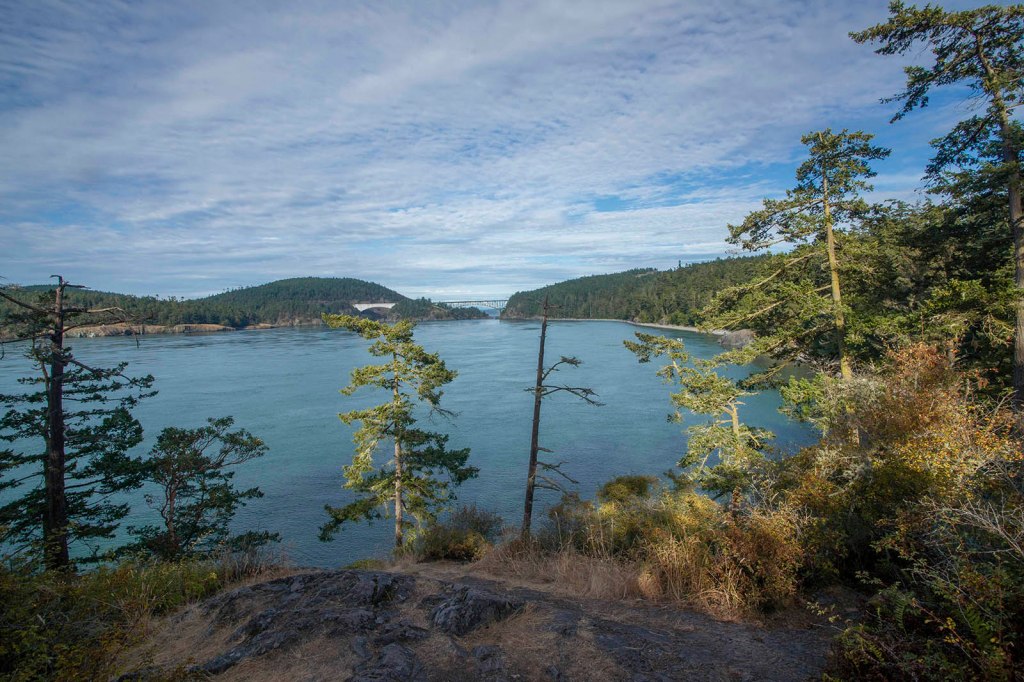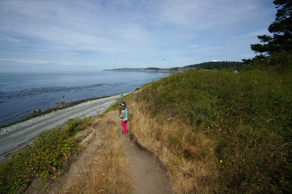 I w zasadzie to zwiedzamy tu tylko pustą drewnianą chatę i zamknięty budynek gospodarski. Park utworzono „ku chwale” pierwszych osadników, którzy przybyli tutaj w latach 1850-tych wykurzając rdzenną ludność indiańską (Skagit People), którą to przesiedlono do sztucznie stworzonych rezerwatów. Jedyną zaletą tego szlaku są obwieszone krzaki jeżyn, którymi to częstujemy nasze podniebienia. Deception Pass State Park (wjazd $10 lub całoroczny pass na parki stanowe $30) do którego następnie wjeżdżamy to najbardziej oblegany park stanowy w stanie Washington. W sumie brakuje nam czasu na jakiś poważniejszy szlak, więc decydujemy się tylko na odwiedzenie zachodniej jego części (West Point), okupowanej głównie przez tzw. niedzielnych turystów. Wybieramy się krótkim szlakiem (a w zasadzie jego częścią) po lesie (Pacific NW trail) wdłóż poszarpanego wybrzeża z kilkoma malutkimi zatokami i dochodzimy do dosyć sporej plaży (North beach) z widokiem na Deception Pass Bridge.