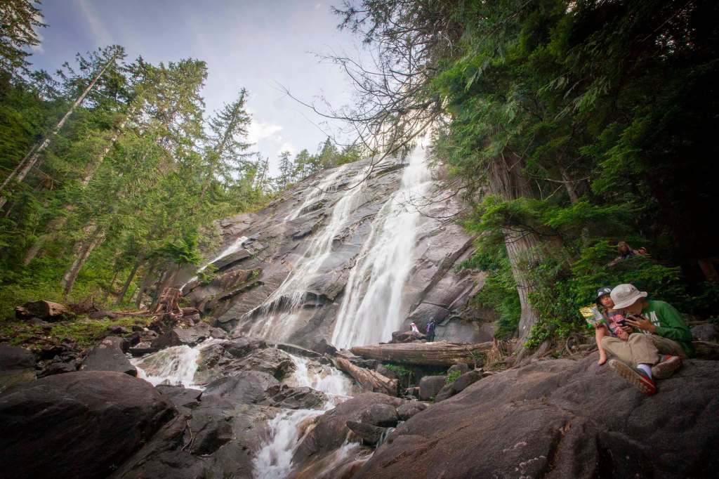 Szlak do wodospadów (długość 2.1 mili) prowadzi cały czas lasem, wznosząc się nieznacznie pod górkę, ale niestety panujący już w najlepszej upał bardo przeszkadza nam w marszu. Dolina rzeki Columbii w lecie poprostu topi się z gorąca…… 😊. Kiedy odpoczywamy sobie pod drzewem (w pierwszej połowie szlaku), mijający nas hikerzy informują nas, że właśnie spotkali niedźwiedzia jakieś kilkadziesiąt metrów od nas. Nie jest jednak zadziwiające, że my go nie widzieliśmy… przy tak wysokim poziomie hałasu jaki produkują moje dzieci, żadne dzikie zwierzę nie ośmieli się nawet odwrócić w naszą stronę. Wodospad Pool of the Winds Fall ma trochę utrudniony dostęp (metalowa barierka), co utrudnia zrobienie dobrego zdjęcia.