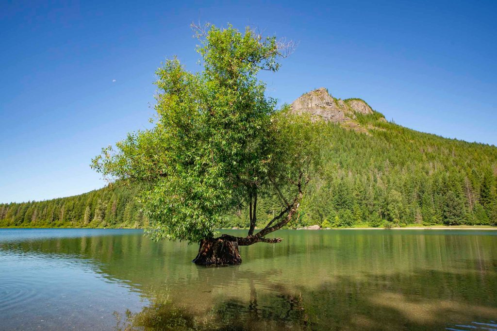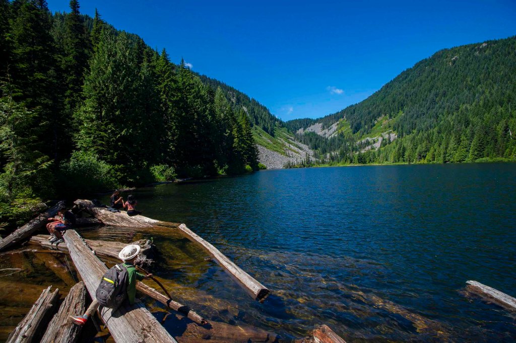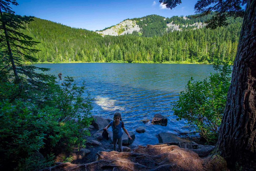 Po zrobieniu kilku fotek wracamy też razem z gęstym tłumem do parkingu, którego okolica tonie już w powciskanych w każdy zakamarek drogi samochodami. Z tego miejsca jedziemy jednokierunkową drogą do wjazdu nr 53 i po przejechaniu 6.5 mili na zachód zjeżdżamy na RD 9030 (exit 45). Dalej szutrową drogą, która już od połowy swojej długości pozastawiana jest zaparkowanymi wzdłuż autami docieramy do wyjścia na szlak prowadzący do jezior Talapus i Olallie. Cały szlak poprowadzony jest lasem – dość przyjemną prostą ścieżką. Po przejściu 1.3 mili dochodzimy do pierwszego jeziora – Talapus lake, gdzie niebezpiecznie rozrzucone kłody drzew tłoczą się przy brzegu dając prowizoryczne miejsce do odpoczynku.