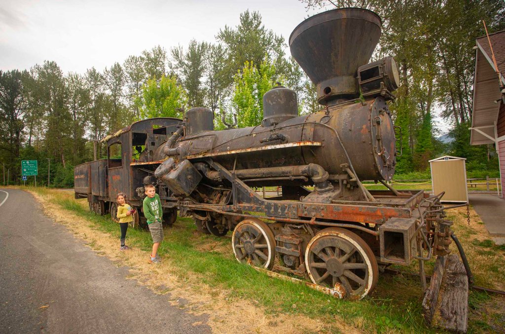Robimy kilka fotek starym odrestaurowanym wagonom kolejowym i zdemolowanej lokomotywie i suniemy dalej do wyjścia na pierwszy szlak Angel & Covel creek falls (długość 3.8 mili).