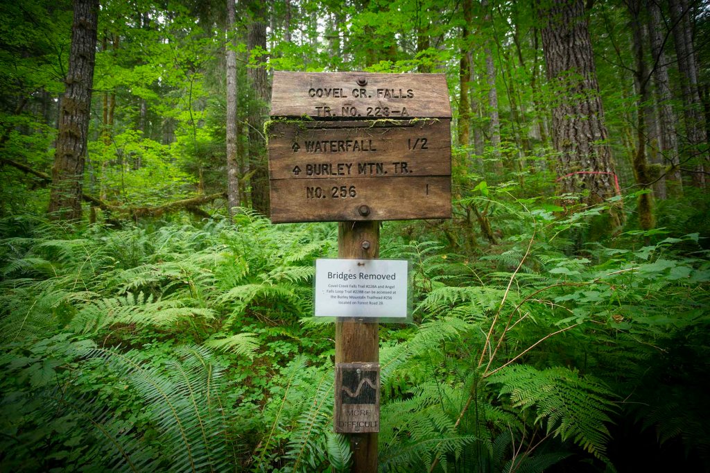 Zajechaliśmy pod Cispus Environmental Center jak sugerował opis na alltrails.com. Wyjście na szlak znajduje się po drugiej stronie Cispus Road (z drogi numer 23 skręt na południe). Przed wejściem na szlak na tablicy informacyjnej umieszczono ogłoszenie, że mosty nad potokami zostały usunięte i wejście na szlak znajduje się zupełnie gdzie indziej w okolicy Burley mountains trail.