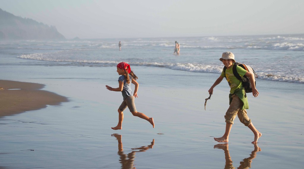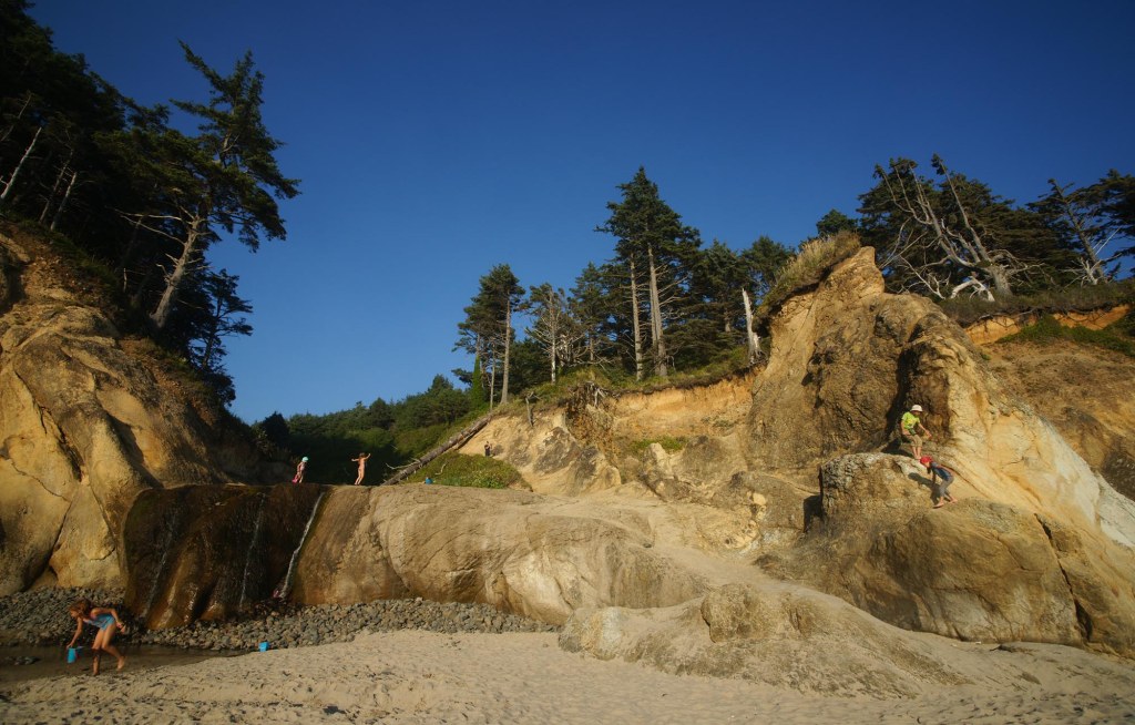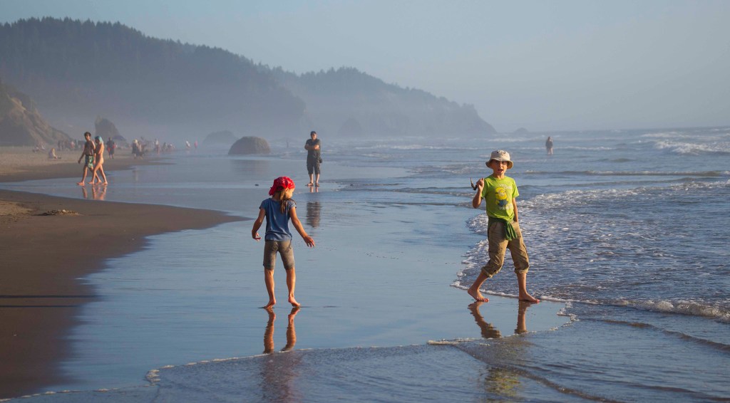 Szlak jest któciutki – około 0.5 mili w obie strony. Sam wodospad generalnie zwyczajny, ale meandrująca płytka rzeka daje wiele możliwości do zabawy dzieciakom, których nie da się od niej odciągnąć. Po dotarciu … w końcu do hotelu w Seaside, rzucamy graty do pokoju i kilkuminutowym spacerkiem docieramy do obszernej piaszczystej plaży, gdzie kończymy dzień zachodem słońca, wygrzebując co chwila z piachu sand crabs, które (jak zostaliśmy poinformowani przez azjatycką rodzinę) są dla niektórych przysmakiem…..