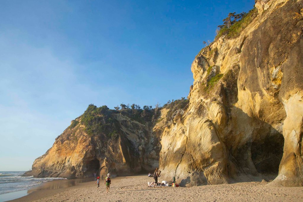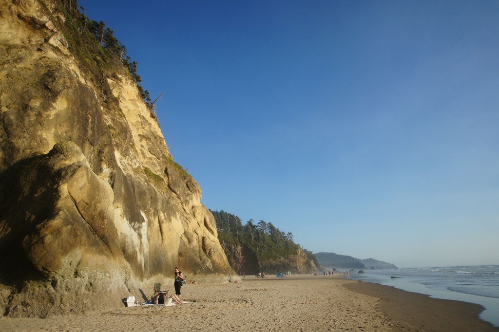 Cannon Beach jest niezwyle popularnym miejscem, więc do godziny 9.30, o której to ewakuujemy się z plaży, spacerowiczów przybywa w zastraszającym tempie. Umorusanych i przemoczonych towarzyszy mojej podróży wrzucam do auta i jedziemy do hotelu na śniadanie i pakowanie. Wyjeżdżamy dopiero jutro, ale chcemy wszystko przygotować by po 4pm znów wyruszyć na kolejną ciekawą geologicznie plażę, znajdującą się nieco na południe od Cannon Beach – Hug Point State Recreation Site (wjazd bezpłatny). Ponieważ jest sobota to możliwość znalezienia parkingu w tym parku równa się praktycznie zeru. Dużym udogodnieniem jest możliwość parkowania wzdłuż drogi. I tu właśnie w odległości około 0.7 mili od plaży wciskamy się z powodzeniem pomiędzy gęsto upakowane auta. Pakujemy latarki, kroksy i przekąski i kolejne 4 godziny spędzamy zwiedzając plażę.