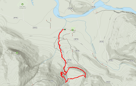 Trzydziestominutowy postój i wracamy gubiąc się niejednokrotnie. Jest 1.30pm. A więc jesteśmy zmuszeni do zmodyfikowania planu na dzień dzisiejszy. Wybieramy trzymilowy szlak Council Bluff trail, bo inne są za długie i nie wystarczy nam czasu. Drogą nr 23 jedziemy na południe, głównie bez asfaltowej powierzchni co znacznie hamuje naszą prędkość. Następnie skręt w NF 2334 i kolejny skręt również w prawo na Council lake campground.