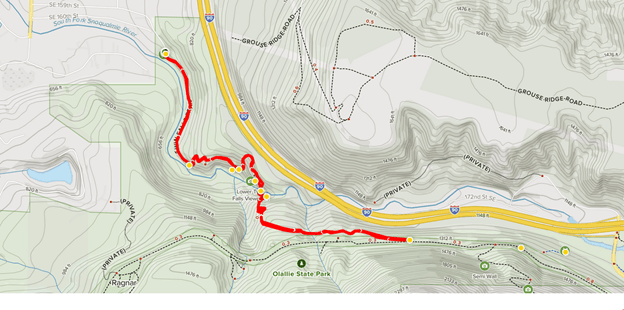 Przeszliśmy więc około mili w jedną stronę i zaczęliśmy się zastanawiać gdzie są ci wszyscy ludzie z parkingu????? Przy czym kropeczka na GPSie wskazywala zbyt bliskie położenie do drogi dojazdowej do autostrady. Nie chcąc kombinować na skróty, które mogłyby okazać się zgubne…. postanowiliśmy wrócić do początku szlaku, a w zasadzie do drogi (Denny Creek Road) i tą drogą zejść do miejsca skąd już wychodził prawidłowy szlak do wodospadu. Tu razem z gęstym tłumem przemieszczaliśmy się w kierunku Frankilna. Jedenastometrowy wodospad położony jest pomiędzy dwoma przęsłami wiaduktu autostrady po której przejeżdżaliśmy wcześniej.