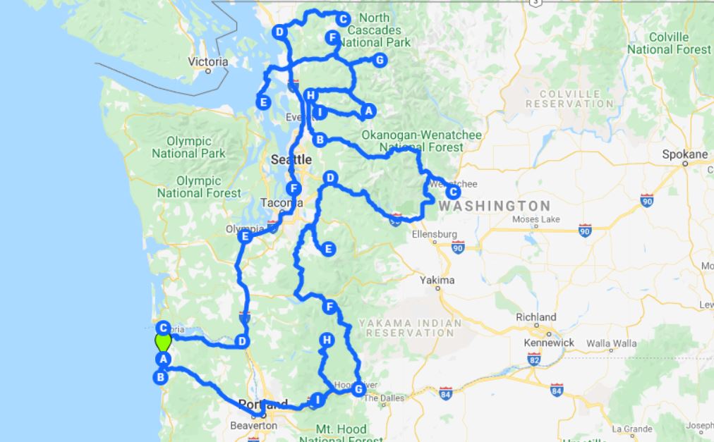 TRASA: [Chicago – Seattle], WASHINGTON: Bellingham, Mount Baker Snoqualmie National Forest (Chain Lakes trail), Fort Casey State Historic Park, Ebey’s Landing wayside, Fort Ebey State Park, Deception Pass State Park, Concrete, Mount Baker Snoqualmie National Forest (Park Butte trail, Sauk Mountain trail, Shadow of the Sentinels trial, Mt. Baker Lake), Rockport, North Cascade National Park (Hidden lake trail), Outback Kangaroo Farm, Mount Baker Snoqualmie National Forest (North Fork Falls trail), Wallace Falls State Park, Bridal Veil falls trail, Iron Goat interpretive Site, Wenatchee, Leavenworth, Cashmere, Red Top Mountain trail, Liberty ghost town, Roslyn, Okanogan Wenatchee National Forest (Franklin Falls trail, Talapus lake and Olallie Lake trail), Snoqualmie Falls, North Bend, Olallie Twin Falls State Park, Rattlesnake Lake, Mount Rainier National Park (Spray falls trail, Tolmie Peak trail), Orting, Elbe – Mt. Rainier Scenic Railroad, Gifford Pinchot National Forest (Covel Creek & Angels Falls trial, Council Bluff trail, Guller Ice Cave, White Salmon, Panther Creek Falls trail, Falls Creek Falls trail, Lower Lewis Falls trail, Beacon Rock State Park – Pool of the winds falls trail, Fort Vancouver HNS; OREGON: Fishhawk Falls trail, Seaside, Cannon Beach, Hug Point State Recreation Area, WASHINGTON: Fort Columbia SHP, Olympia, [Seattle – Chicago].