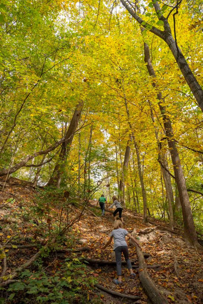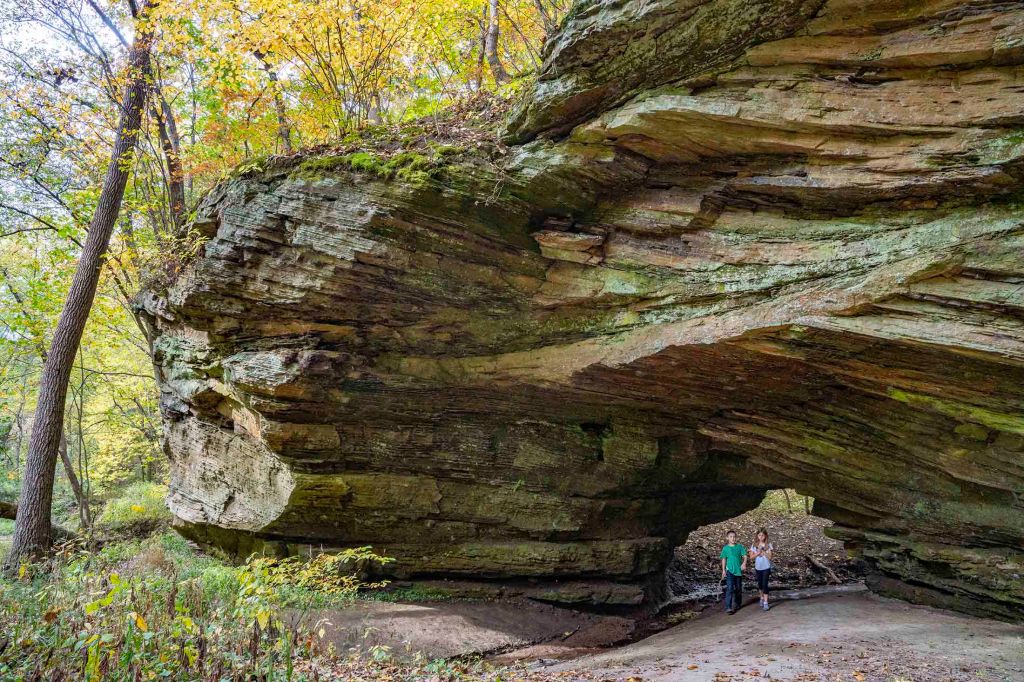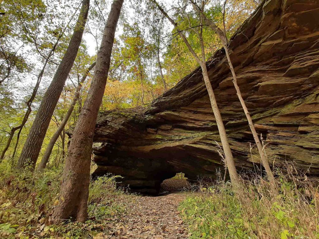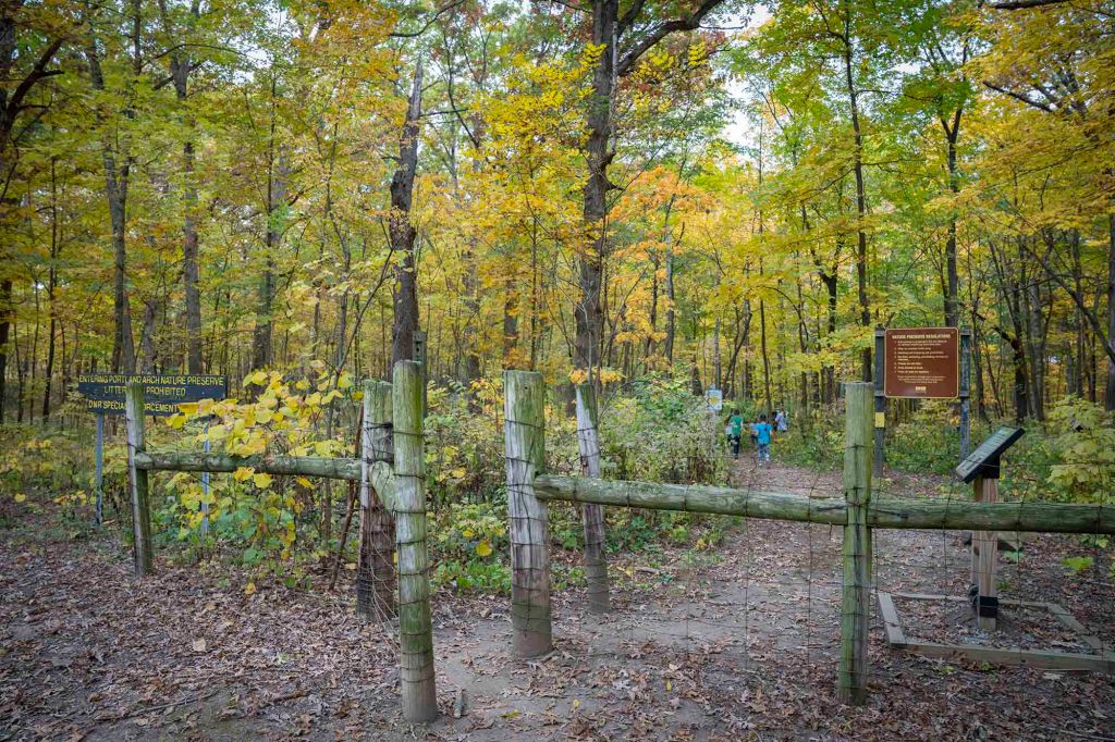 Zjeżdżamy z 41-ki na drogę W 650N i jadąc na zachód przez pola wyschniętej kukurydzy dojeżdżamy do wyjścia na szlak North trail w Portland Arch Nature Preserve (długość 1 mila). Szlak – pętla jest bardzo łatwym (w zasadzie bez większej zmiany elewacji) i przyjemnym spacerem po lesie.