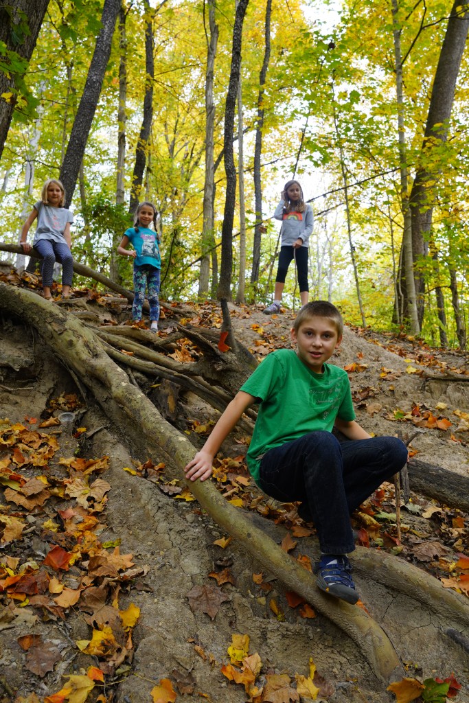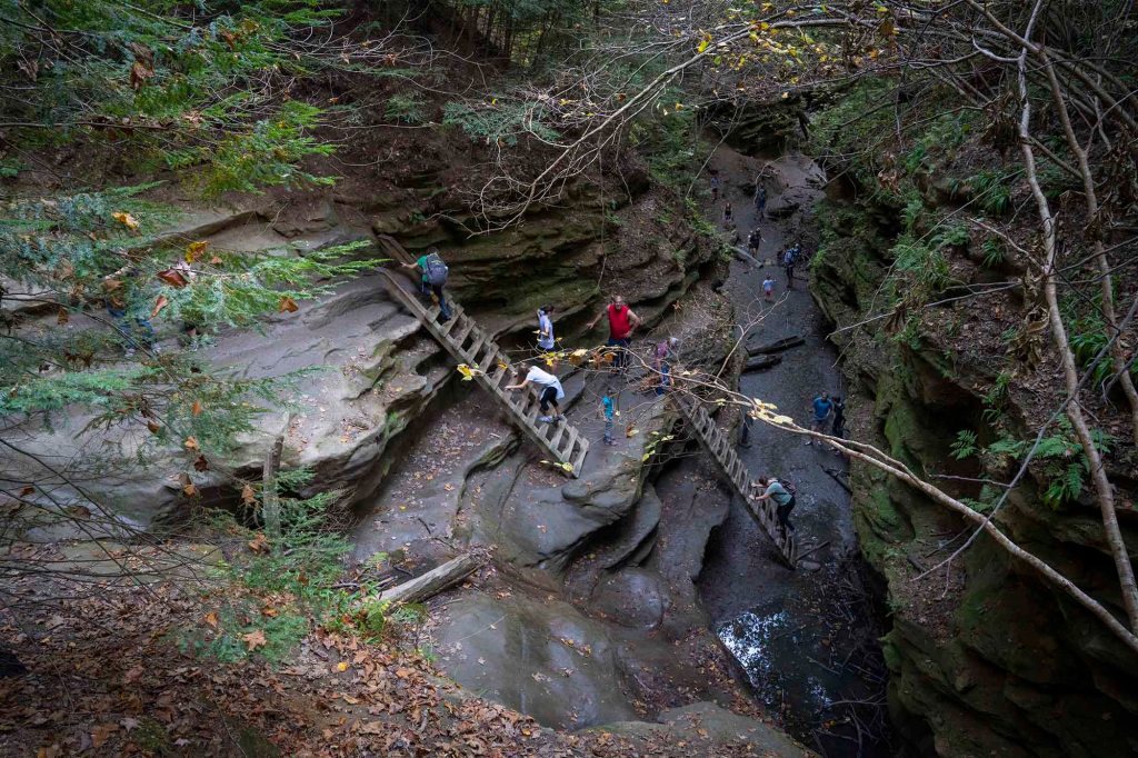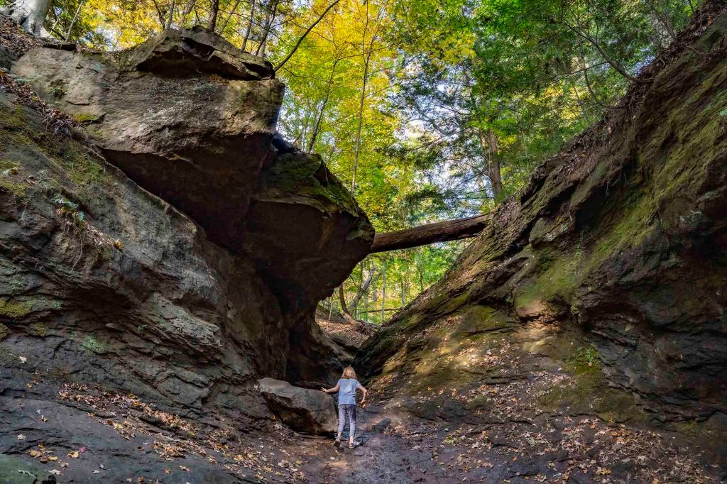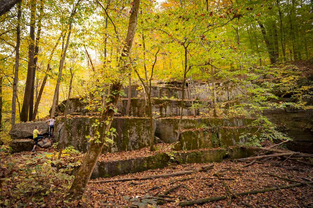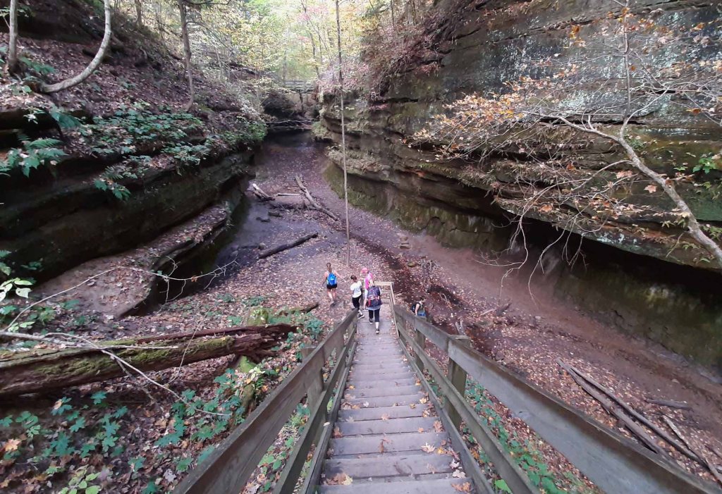 W 1850-tych latach prowadzono tu zintensyfikowaną wycinkę drzew wspomaganą ulokowanym nieopodal tartakiem. Inwestycja okazała się jednak mało dochodowa i młyn opuszczono po kilku latach. Część szlaku – Devil’s Backbone jest bardzo stroma i niebezpieczna – przejście 1,5 metrowej szerokości groblą z 30 metrowymi przepaściami po obu stronach zostawiamy dla tych najodważniejszych 😊… my z dzieciakami musieliśmy zawrócić… Panika była tu jak najbardziej uzasadniona. Upadek z takiej wysokości daje raczej małe szanse na przeżycie. Krążymy trochę po częściowo wyschniętym korycie rzecznym i z powrotem wdrapujemy się po drewnianych schodkach już ledwo dysząc, bo gorąco i wilgotność powietrza sięga dziś granic wytrzymałości. Ostatnią naszą atrakcją na dzień dzisiejszy jest zabytkowy młyn Mansfield Roller Mill State Historic Site (6087 Mill Rd, Carbon) ulokowany nad Big Racoon Creek.