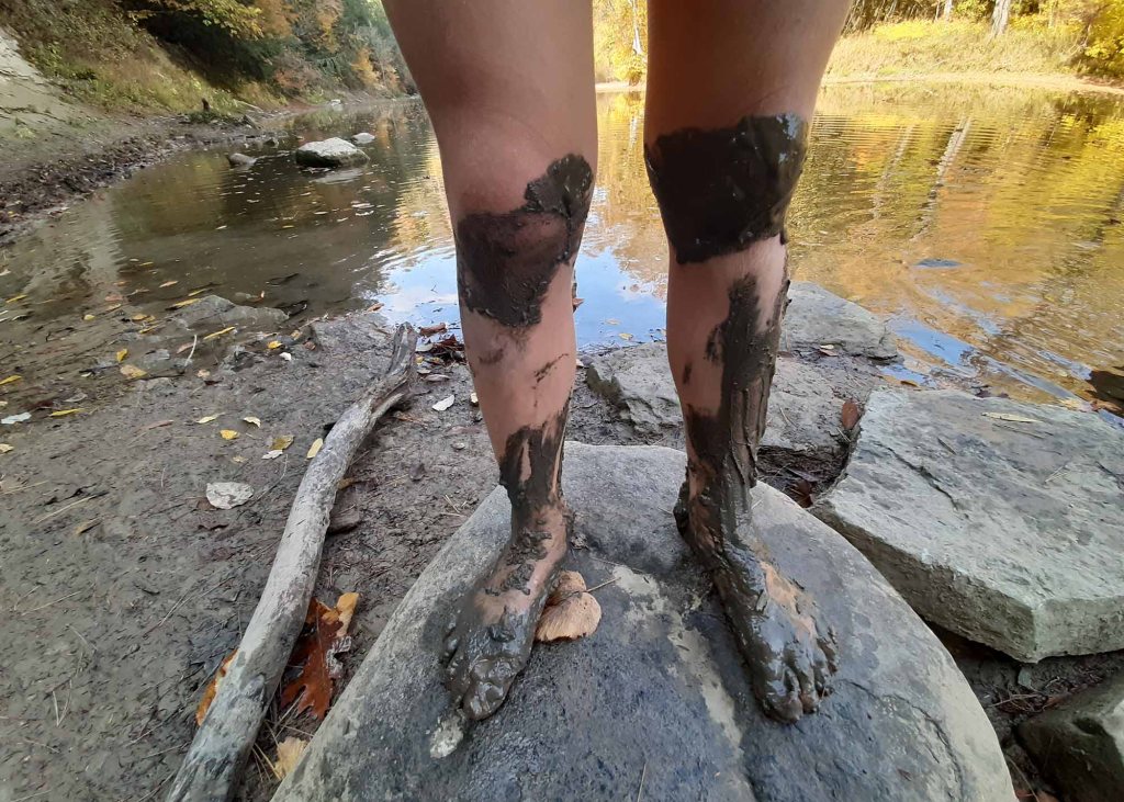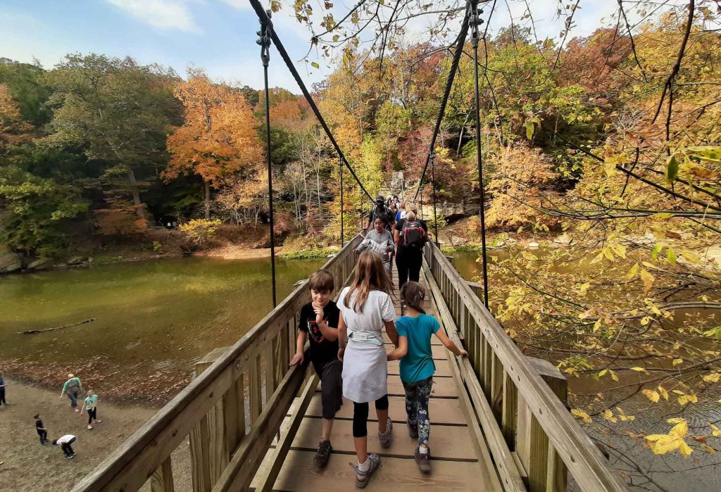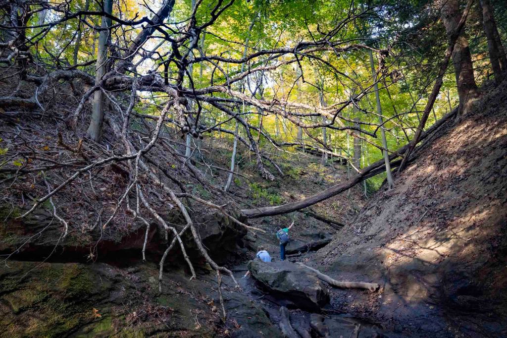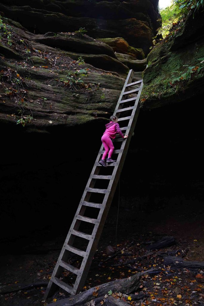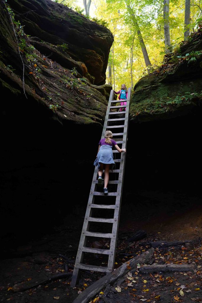 W 1850-tych latach prowadzono tu zintensyfikowaną wycinkę drzew wspomaganą ulokowanym nieopodal tartakiem. Inwestycja okazała się jednak mało dochodowa i młyn opuszczono po kilku latach. Część szlaku – Devil’s Backbone jest bardzo stroma i niebezpieczna – przejście 1,5 metrowej szerokości groblą z 30 metrowymi przepaściami po obu stronach zostawiamy dla tych najodważniejszych 😊… my z dzieciakami musieliśmy zawrócić… Panika była tu jak najbardziej uzasadniona. Upadek z takiej wysokości daje raczej małe szanse na przeżycie. Krążymy trochę po częściowo wyschniętym korycie rzecznym i z powrotem wdrapujemy się po drewnianych schodkach już ledwo dysząc, bo gorąco i wilgotność powietrza sięga dziś granic wytrzymałości. Ostatnią naszą atrakcją na dzień dzisiejszy jest zabytkowy młyn Mansfield Roller Mill State Historic Site (6087 Mill Rd, Carbon) ulokowany nad Big Racoon Creek.