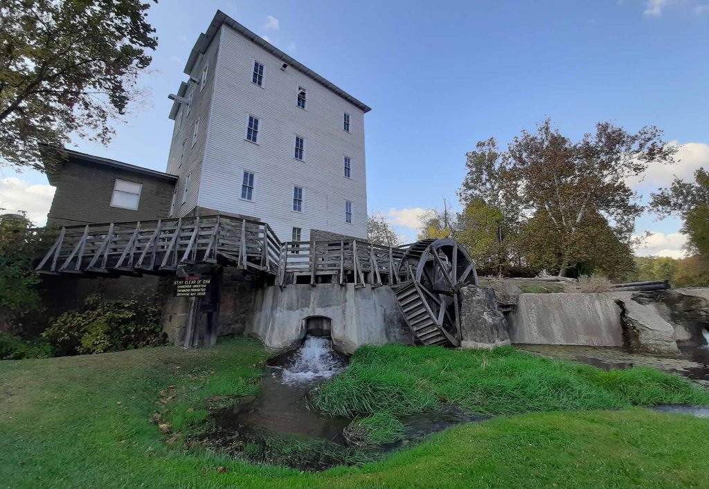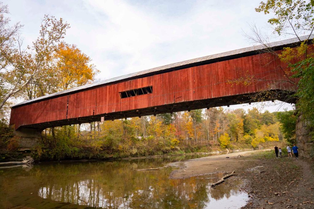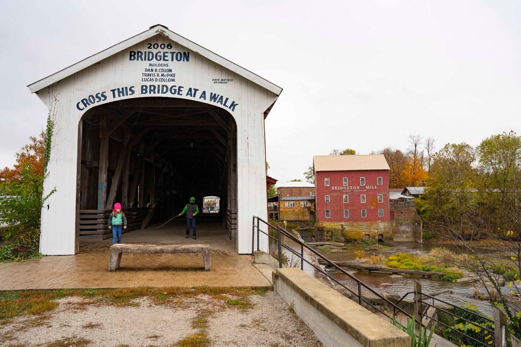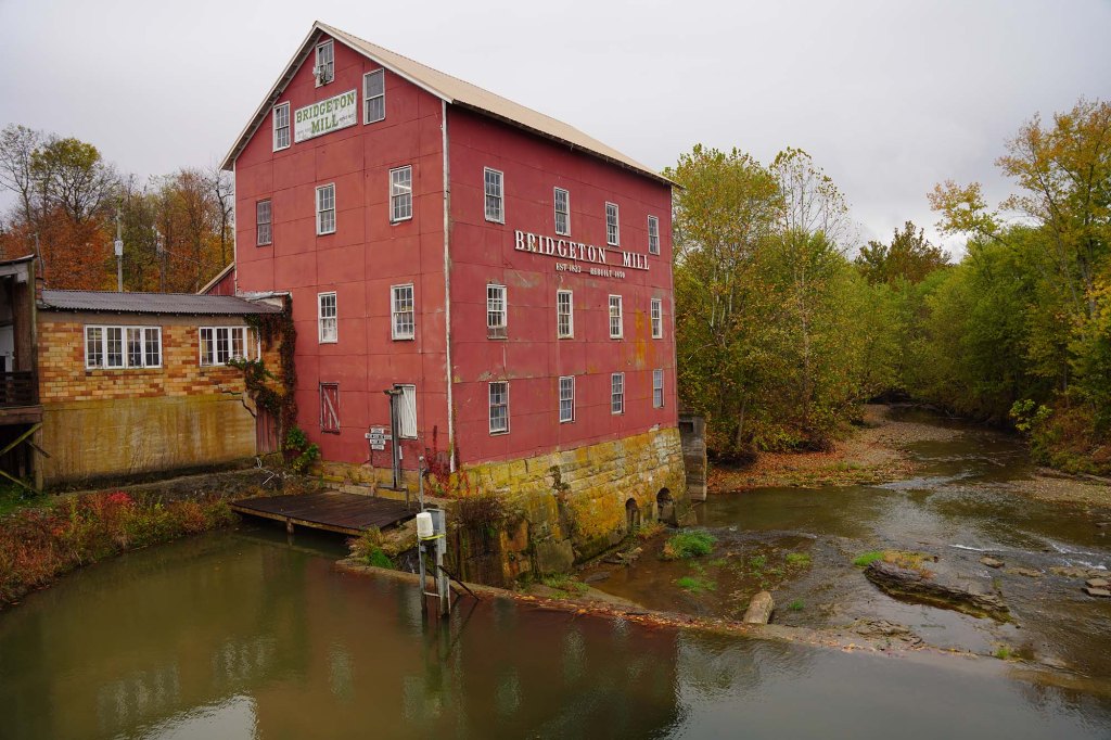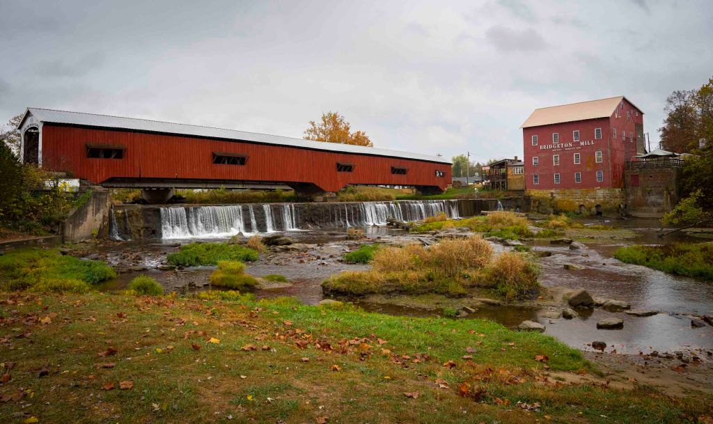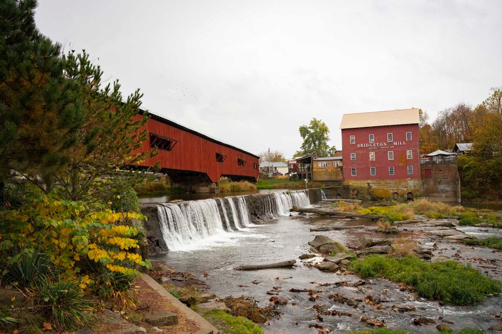 Zabytkowy budynek młynu komponuje się tu idealnie z czerwonym „Covered Bridge”.