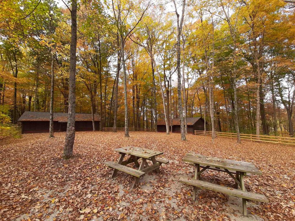 Dochodzimy do potężnej rzeki White River. Następnie odbijamy w bok by dojść do punktu widokowego, ale nic poza zadaszonym shelterem niestety tu nie znajdujemy. Przechodzimy obok kempingu i zmieniamy szlak na #10 i tu trochę wszystko się nam miesza, bo mapa parkowa jest bardzo niedokładna. Schodzimy po stromych drewnianych schodach do doliny rzeki, gdzie spędzamy chwilę mocząc nogi w strumieniu. Zaczynamy strome podejście jakąś dziką słabowydeptaną ścieżką i wychodzimy na wprost camp McCormick Group camp (swoją drogą przesuperowe miejce na kolonie czy oboz dla dzieciaków) całe zasypane złotymi liśćmi.
