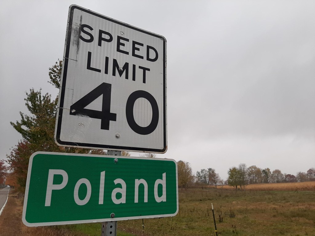 Z tej właśnie plaży podziwiamy spływający powolnie wodospad w otoczeniu jesiennych liści. Nie mamy szansy pobyć tu dłużej bo nadciąga załamanie pogody i zaczyna padać deszcz, który szybko zamienia się w ulewę…. przerywając nasze zwiedzanie. W strugach deszczu przejeżdżamy przez Poland – malutką mieścinę z jednym skrzyżowaniem i kilkoma starymi domami.