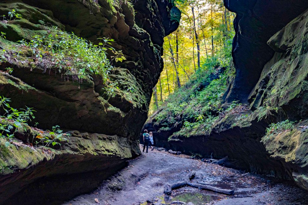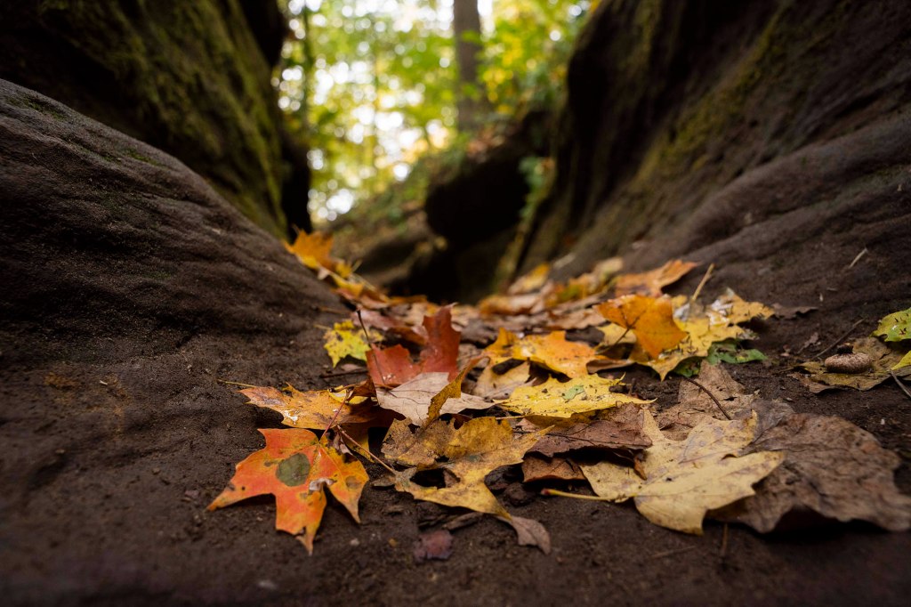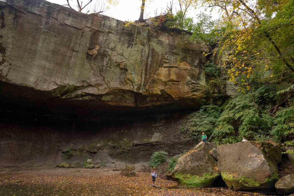 i kierujemy się do ostatniego docelowego dziś punktu – Turkey Run State Park ($9/auto). Najbardziej charakterystycznym elementem parku są wąwozy wyrzeźbione w piaskowcowych skałach kilka tysięcy lat temu przez polodowcowe strumienie, piękne liściaste lasy i przepływająca przez park rzeka Sugar Creek. Nazwa parku pochodzi od … uciekających indyków…. Dzikie indyki licznie zamieszkujące te tereny podczas zimniejszych dni gromadziły się w wąskich kanionach, by ogrzać się nieco i osłonic od wiatru. Wykorzystywali to myśliwi, którzy masowo je wyłapywali…..a biedne indyki poprostu uciekały z kanionów w popłochu. Sugar Creek – jedna z najczystszych i najpiękniejszych rzek Indiany – jest bardzo popularnym miejscem spływów kajakowych podczas lata i wczesnej jesieni. Kilka prywatnych firm stacjonujących poza parkiem oferuje ich wynajem lub zorganizowane wycieczki. Ceny za wynajem kajaka zaczynają się już od $17 za 3,5 milową wycieczkę (czas trwania do 1,5 h), za canoe musimy zapłacić trochę więcej bo $22. Jeśli interesuje nas trochę dłuższe wiosłowanie to możemy wybrać dystans 15 milowy (maksymalnie 7 godzin) i wtedy cena za kajak to $26, a za canoe $34. Podcas naszego pobytu poziom wody jest ekstremalnie niski i zainteresowanie tą formą rekreacji praktycznie minimalne.