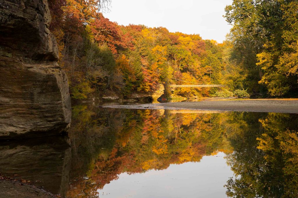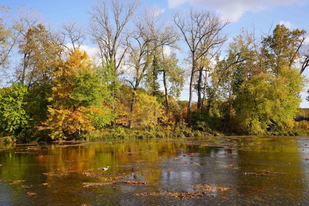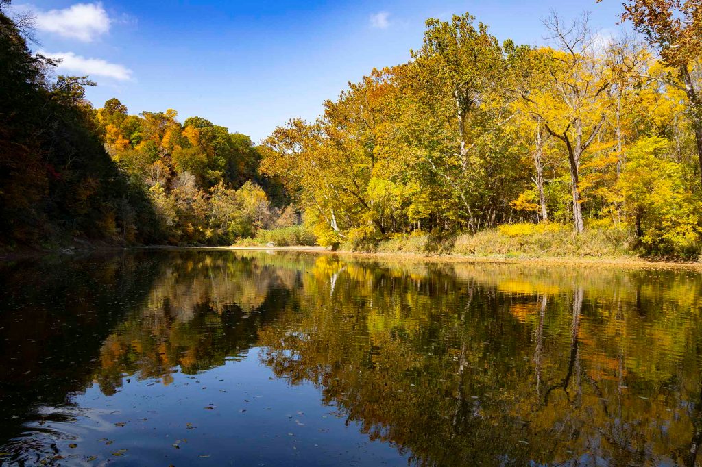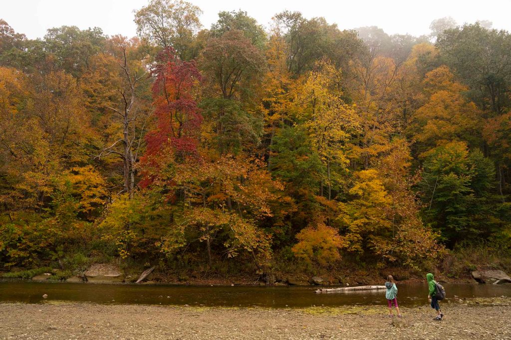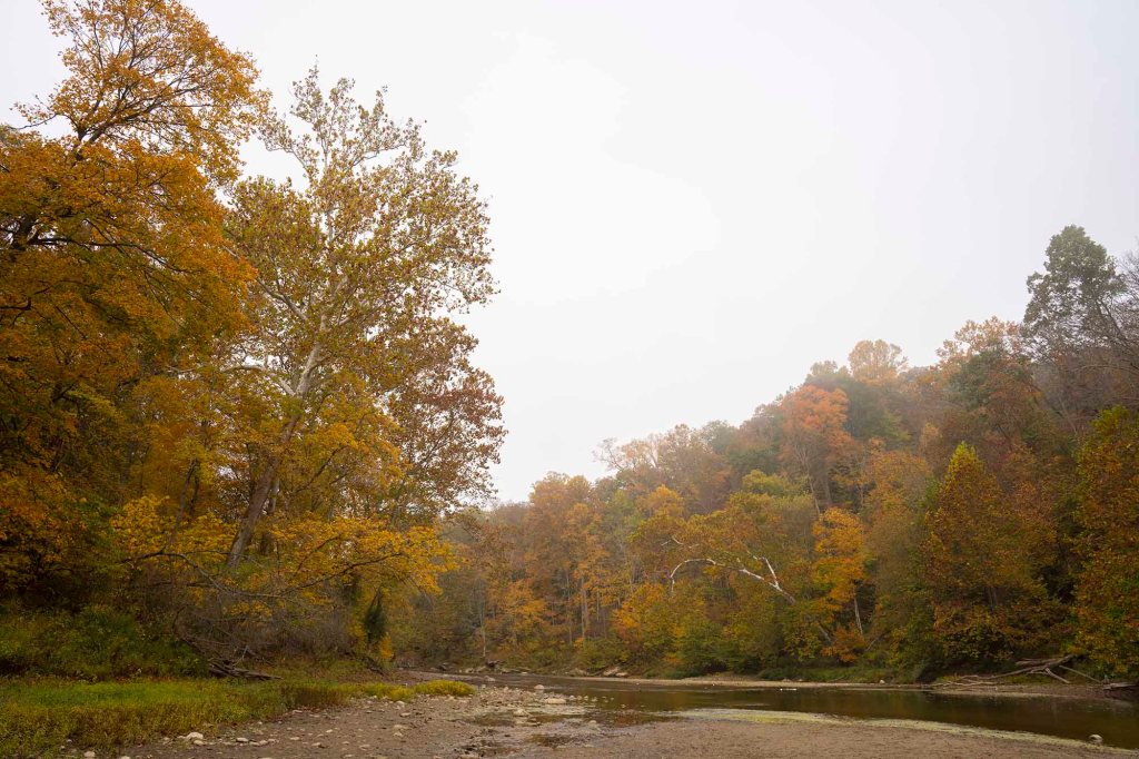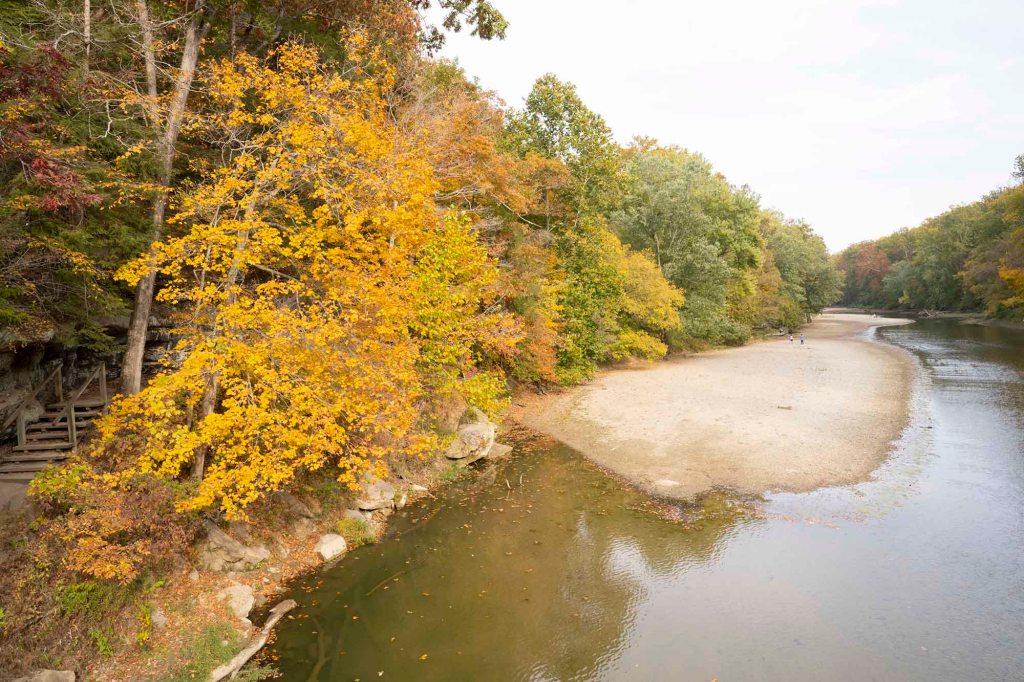 Pętelka z powrotem doprowadza nas do szlaku numer 3. Tu idąc chwilkę schodzimy na brzeg rzeki by móc sfotografować jeden z piękniejszych widoków w parku – mieniące się jesiennymi kolorami choiny, dęby, orzechowce i jawory w otoczeniu wolno płynącej rzeki Sugar creek.