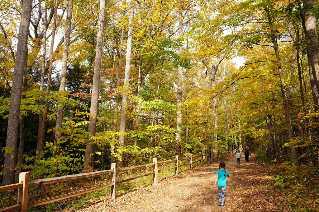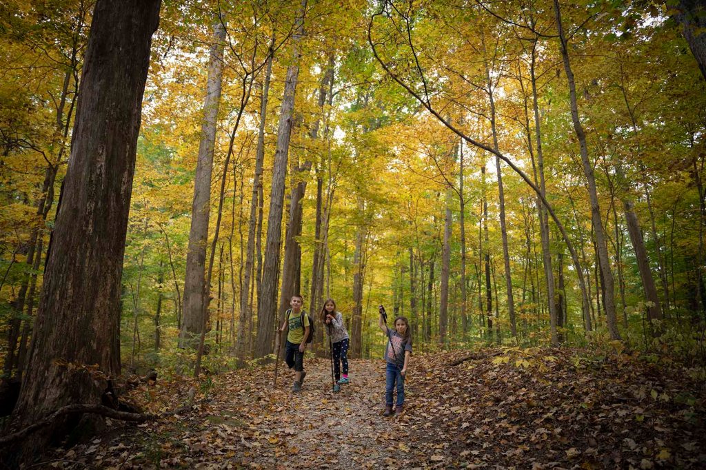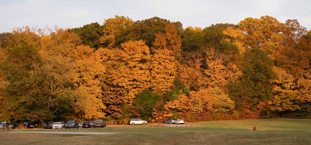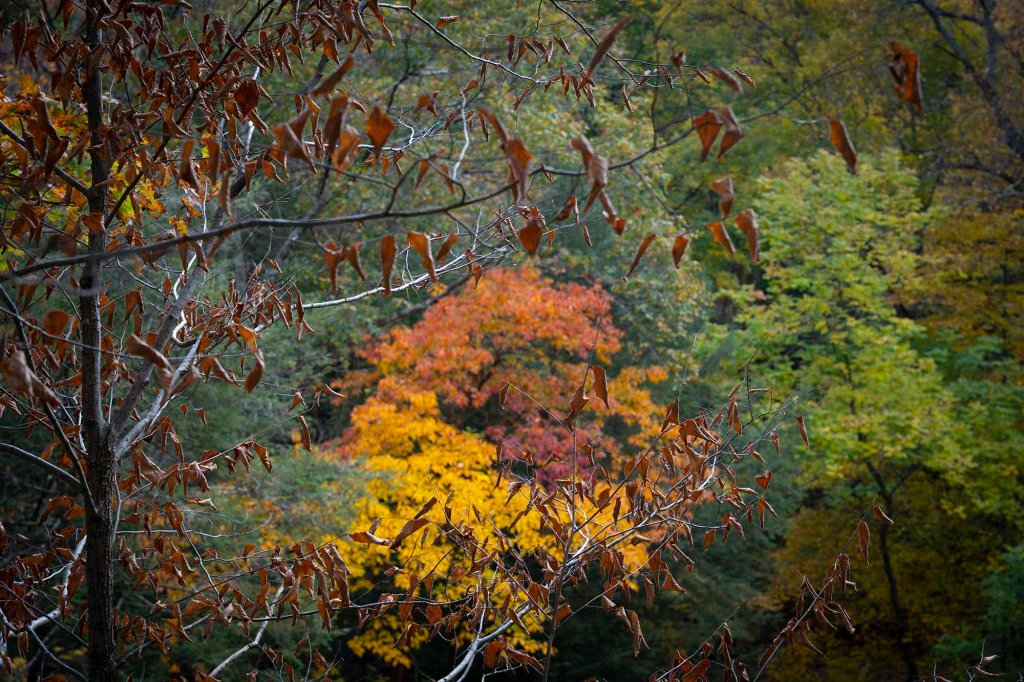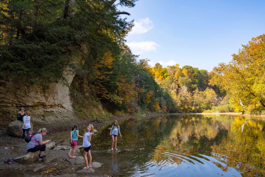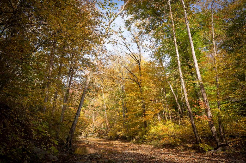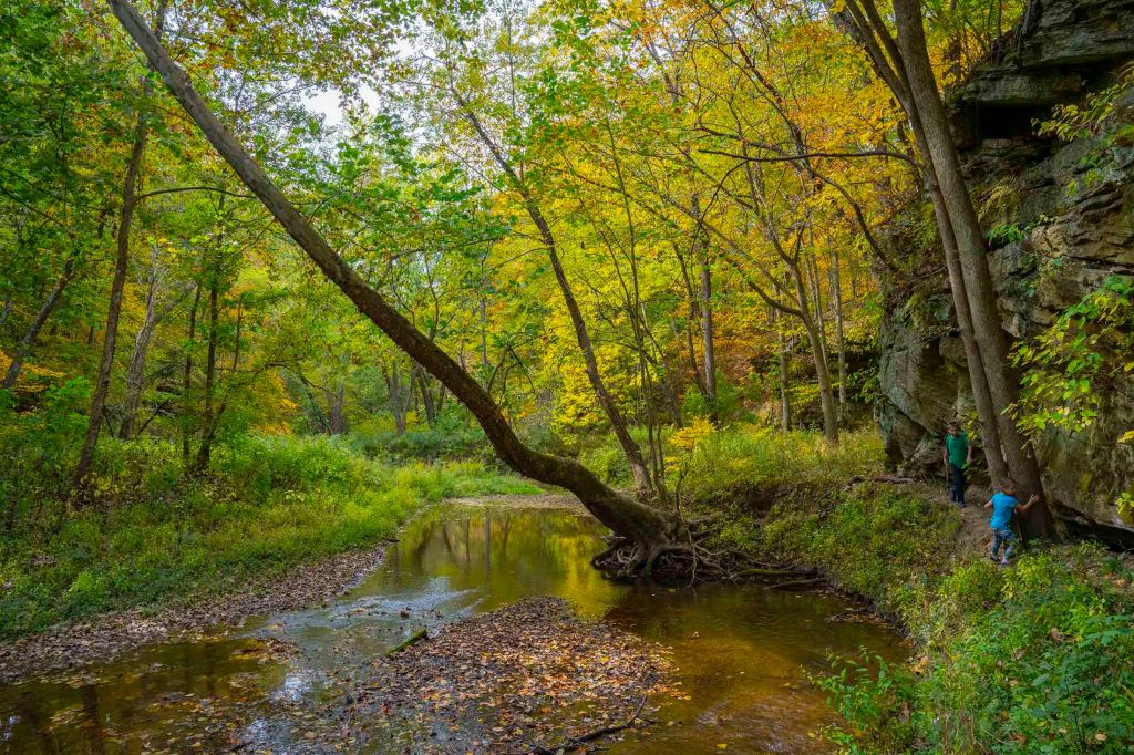 Pętelka z powrotem doprowadza nas do szlaku numer 3. Tu idąc chwilkę schodzimy na brzeg rzeki by móc sfotografować jeden z piękniejszych widoków w parku – mieniące się jesiennymi kolorami choiny, dęby, orzechowce i jawory w otoczeniu wolno płynącej rzeki Sugar creek.