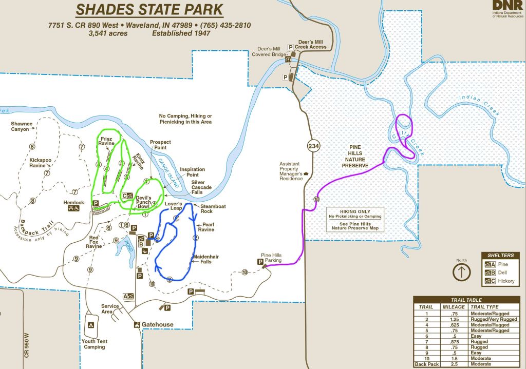 Pomino, że park położony jest na znacznie większym terenie niż Turkey Run notuje się tu 6 razy mniej odwiedzających. Nazwa parku – pierwotnie „Shades of Death” („Odcienie śmierci”) została zmieniona ze względu na dość niesmaczny wydźwięk. Legenda głosi, że na początku XIX wieku młoda osadniczka zabiła tu siekierą swojego nikczemnego męża…a czyn ten później uznano jako obrona własna. W 1816 roku w głębokich wąwozach parku odkryto mineralne źródła, które stały sie od razu docelowym miejscem rekreacji okolicznych mieszkańców. Kiedy sekret wyszedł na jaw terenem zainteresowała się prywatna spółka, która w 1887 wybudowała tu sanatorium. W 1948 roku oficjalnie sprzedano ziemie zarządowi parków stanowych. Fundusze na ten cel ($262,000) pochodziły tylko i wyłącznie od mieszkańców Indiany. Samym dzieciakom z okolicznych podstawówek udało się uzbierać aż $11,000. Sprawa była tak bardzo nagłośniona przez wszystkie media, że na ceremonię otwarcia przybyło ponad 10,000 ludzi. Była to wielka społeczna inicjatywa zakończona sukcesem, z którego teraz wszyscy możemy czerpać korzyści 😊.