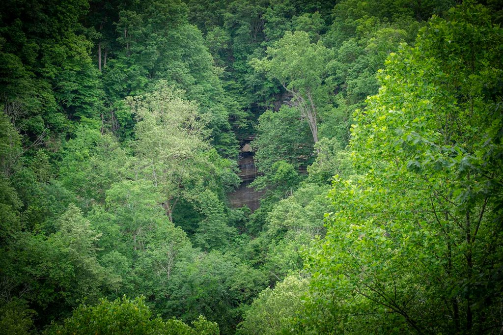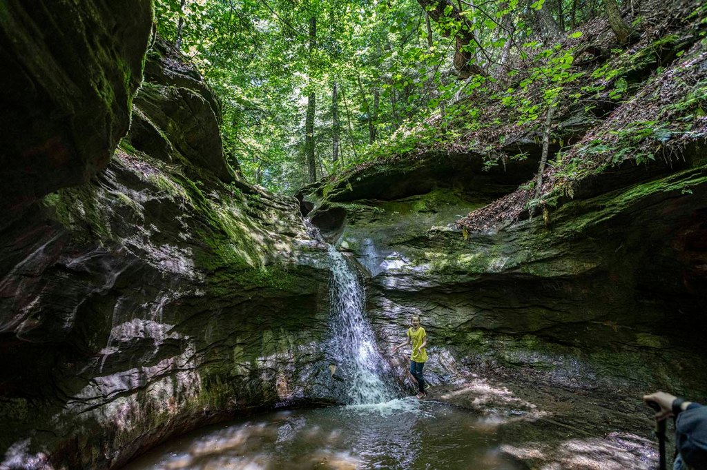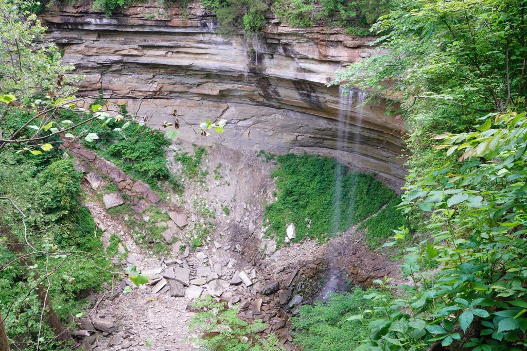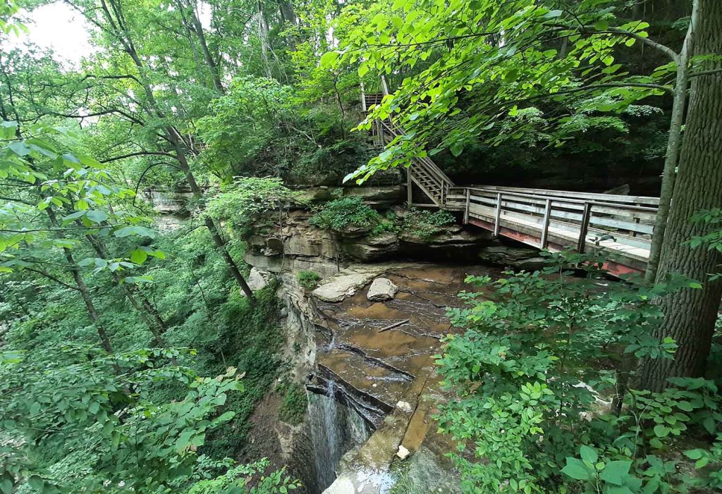 Można też zjechać (na tyłku) stromo w dół bezpośrednio za nowym drewnianym tarasem. Jest to najwyższy wodospad w stanie Indiana (27 metrów wysokości). Woda spada z wielkim hukiem z wielkiej piaskowcowej półki wpadając do strumienia Fall Creek.