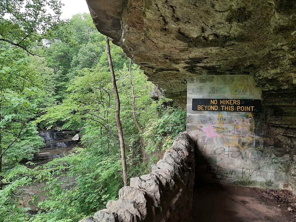 Schodzimy po kamiennych schodach do pierwszego wielkiego klifu, z którego to podczas obfitującej w deszcze wiosny spływa wodospad. (Niestety tegoroczna wiosna nie należała do zbytnio mokrych, więc nie możemy też liczyć na wodospady). Schodzimy w dół do potoku i ponieważ przepływ wody jest minimalny wędrujemy jego wyschniętym korytem po kamieniach …jak się okazuje za daleko….. gubiąc przy tym szlak. Ale tu spotyka nas niespodzianka. Ktoś rozrzucił całe mnóstwo kolorowych minerałów (zakupionych zapewne w Marengo Caves Visitor Center) …jeden za drugim…jakby specjalnie chciał nas poprowadzić złą ścieżką… Idąc rzeką i zbierając błyszczące kamyki nie zauważyliśmy, że szlak odbija w lewo. Pobłądziliśmy trochę natrafiając na jakieś stare obozowiska i okręgi ogniskowe i nie mogąc znaleźć ścieżki cofnęliśmy się korytem rzeki, aż w końcu ją odnaleźliśmy i odbiliśmy w lewo do rozwidlenia dróg. Dalej szlak tworzy malutką pętlę wokół klifów, zagłębiając się w kanion z jednej strony i wychodząc z drugiej (długość 0.2 mile).