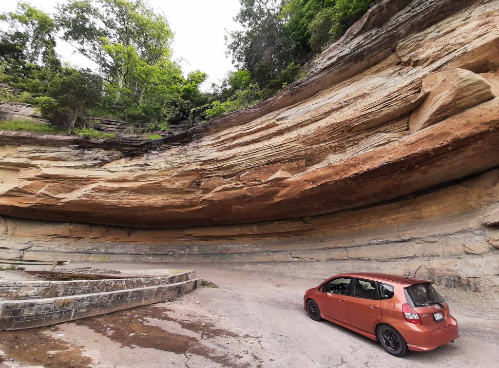 Wyjeżdżając z miasteczka zatrzymujemy się jeszcze przy Hanging Rock (Hwy 7) – malowniczym wapiennym urwiskiem, z którego podczas wilgotniejszych dni spada wodospad prosto na drogę.