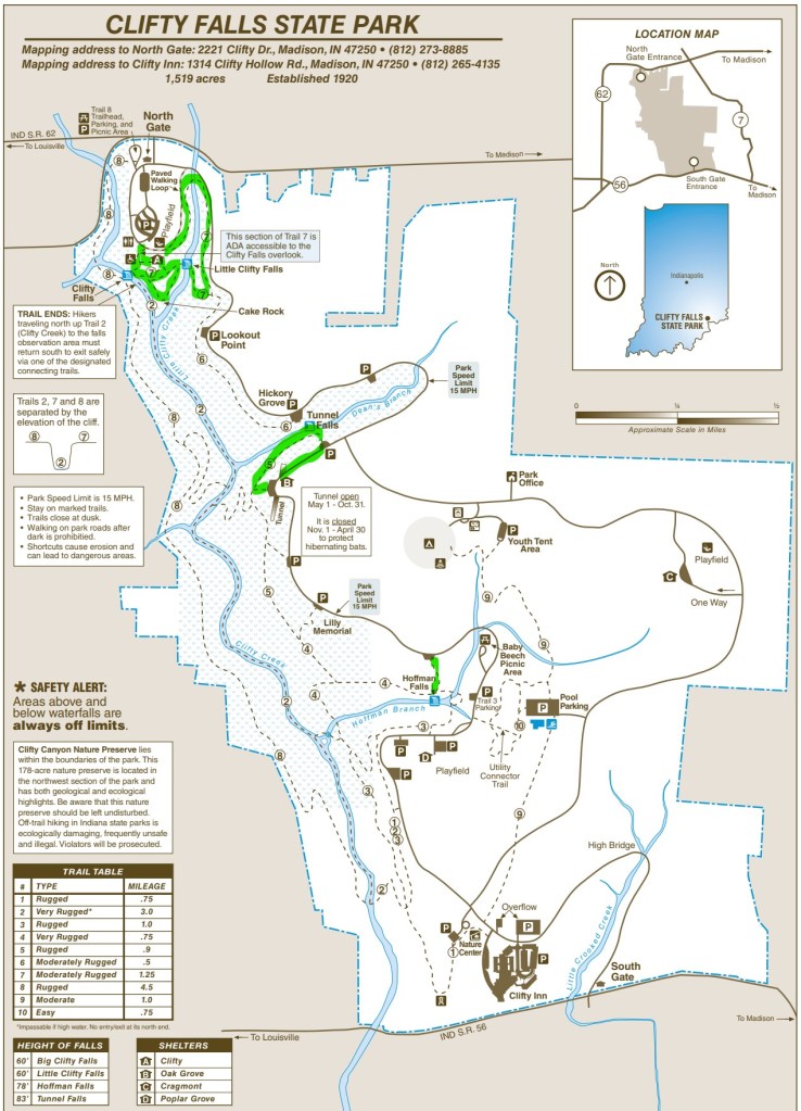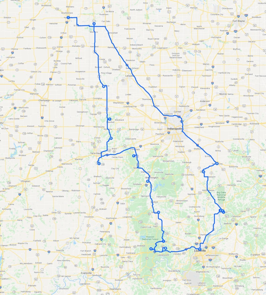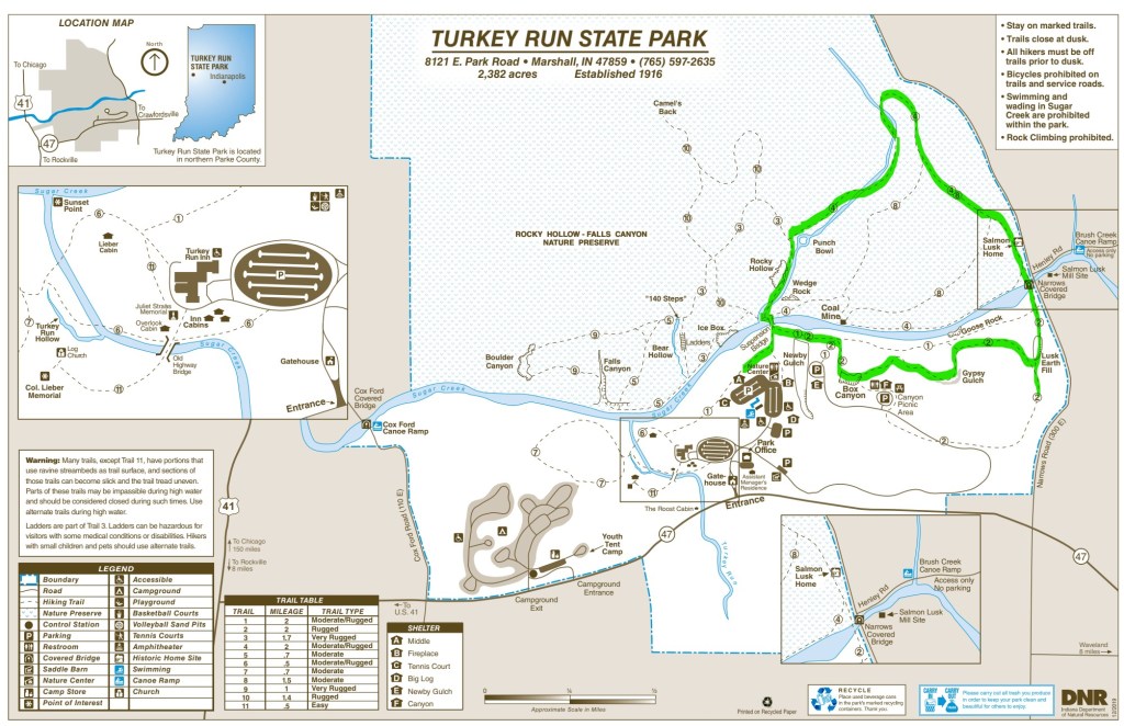 TRASA: Kankakee Sands Bison viewing area, Williamsport falls, Wilkin’s mill covered bridge, Turkey Run state park (Wedge Rock, Rocky Hollow, Punch Bowl, Lusk Home, Narrows Covered Bridge, Lusk Earth Fill, Gypsy gulch, Box canyon), Bridgeton mill, Fowler park/Irishman cover bridge, Cataract State Park upper & lower, Leonard Spring Nature Park, Spring Mill State park (Twin Caves + Browson cave, Pioneer Village), Marengo Caves (Crystal Palace, Dripstone Trail), Hemlock Cliffs rec area, Shoe tree, CLARKSVILLE, Falls of the Ohio state park, Cliffy Falls State park (Cliffty falls + Little Cliffty falls + Cake rock trail, Tunnel falls), MADISON: Historic District NPS, Hanging Rock, Anderson Falls, Greensburg.