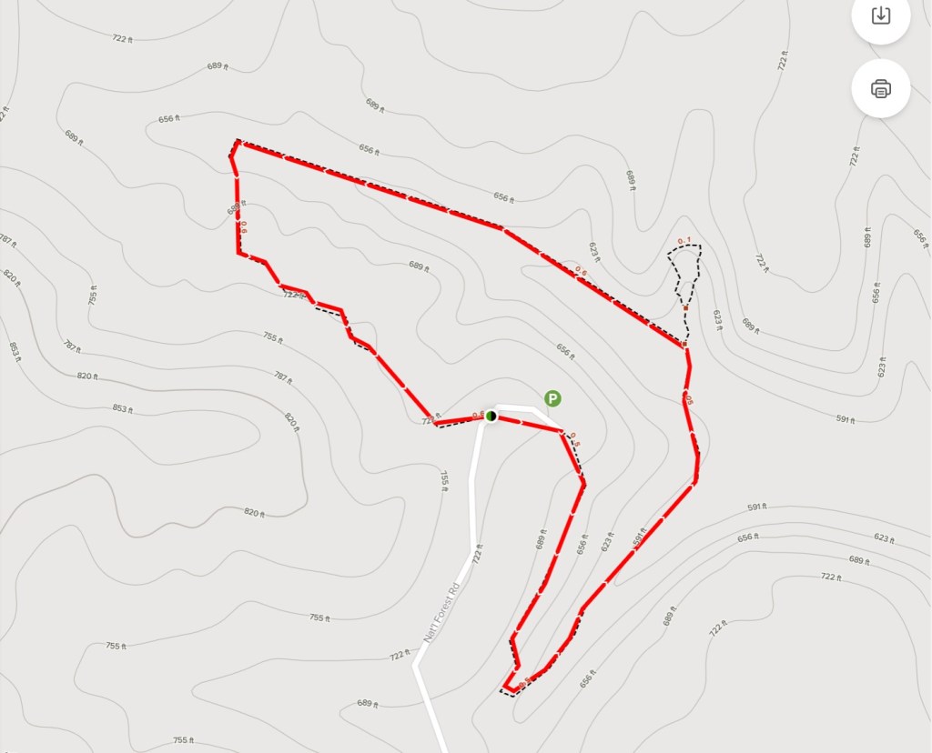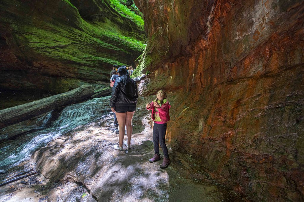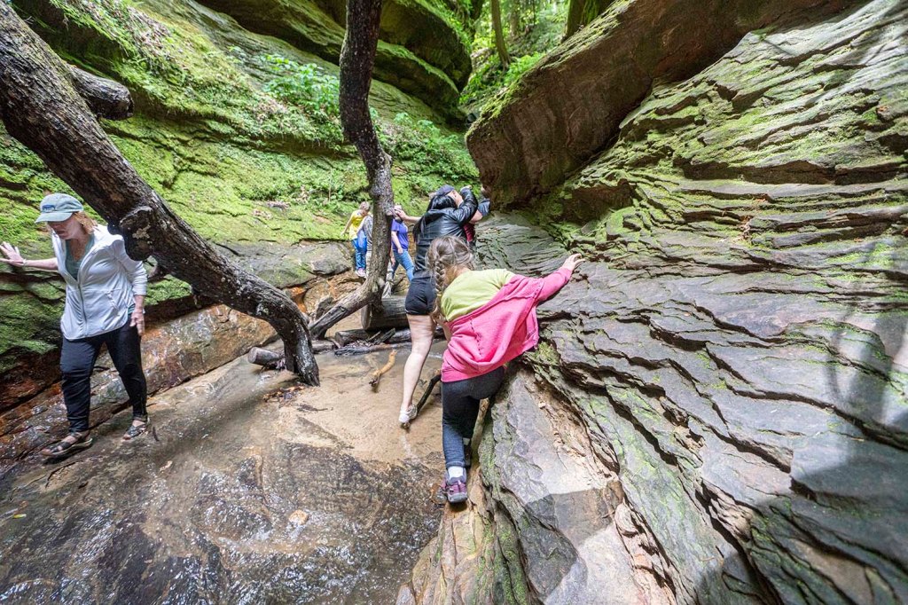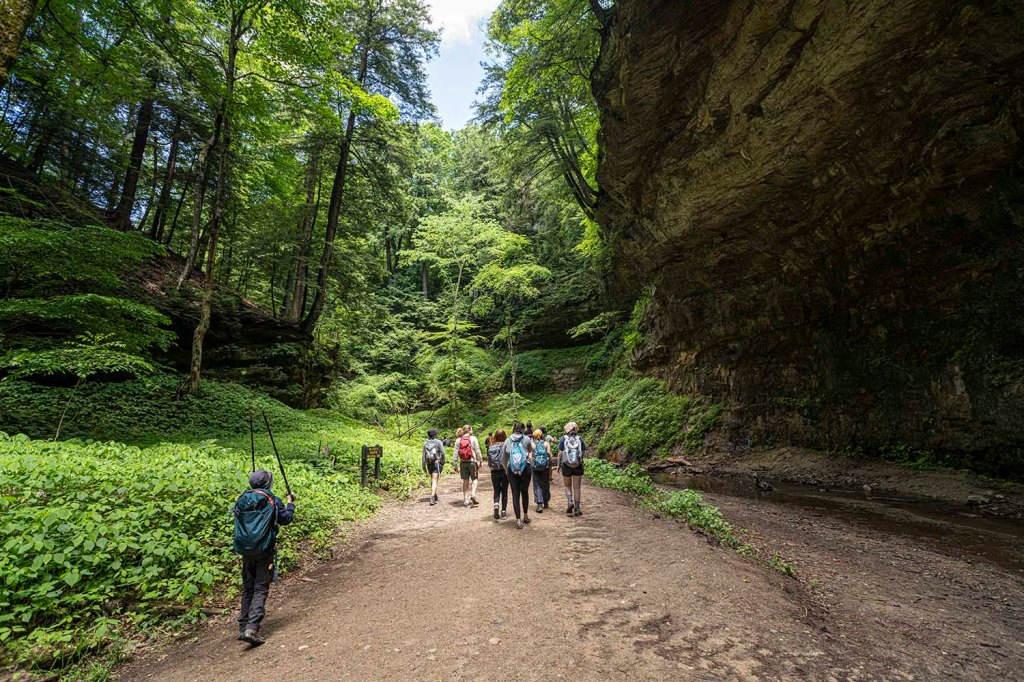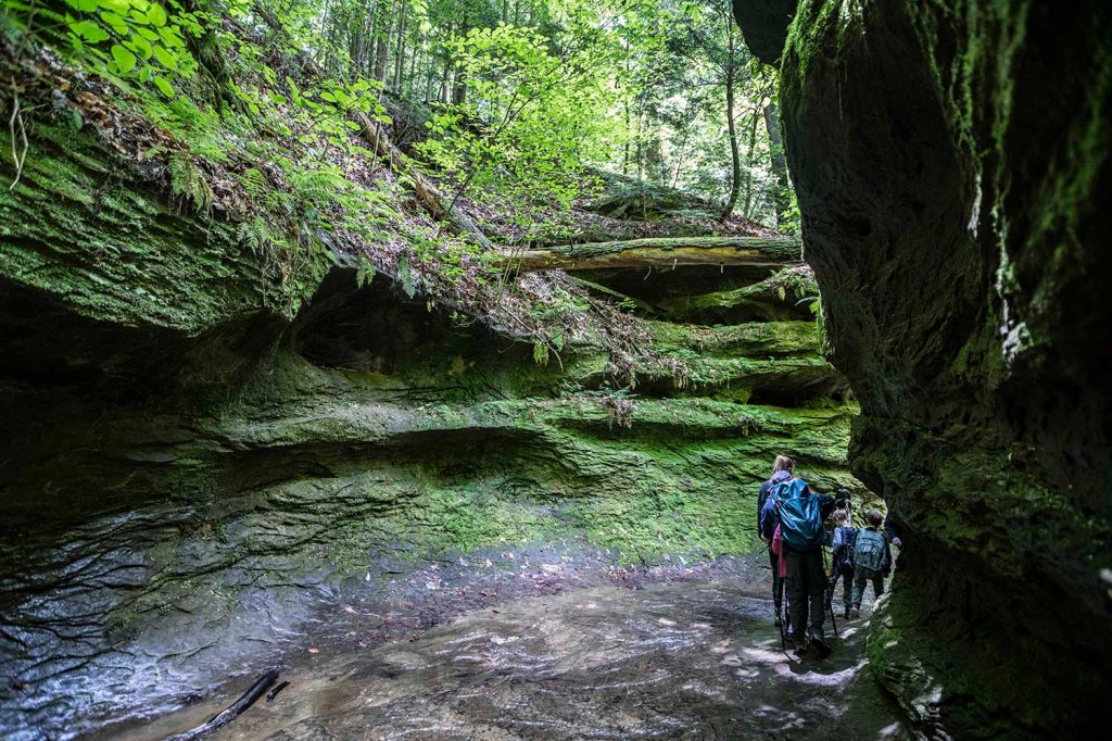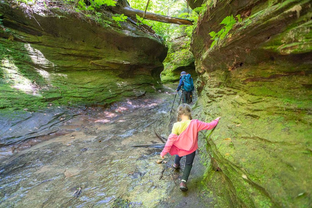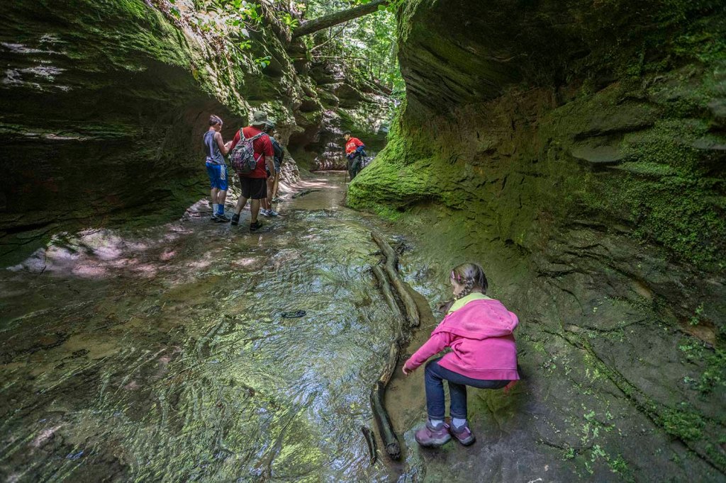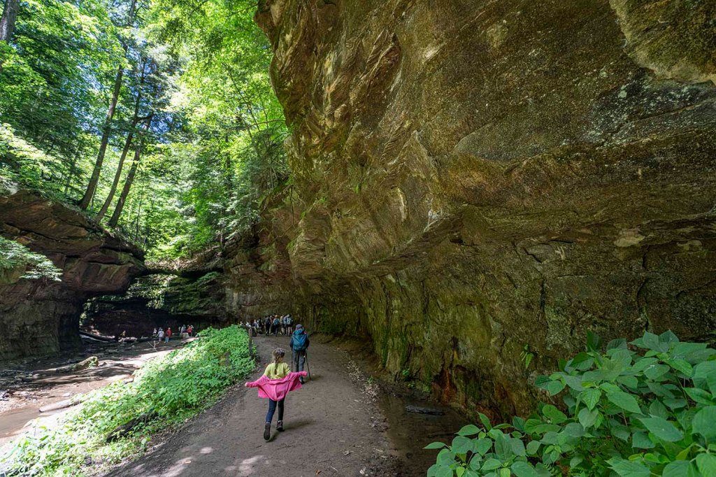 Po zwiedzeniu jaskiń i odnalezieniu skarbów jedziemy na spacer do Hoosier National Forest). Szlak Hemlock Cliffs (długość 1,4 mili) prowadzi nas przez wyjątkowo piękny kanion zarośnięty gęstym lasem. Zaczynamy skręcając w prawo.