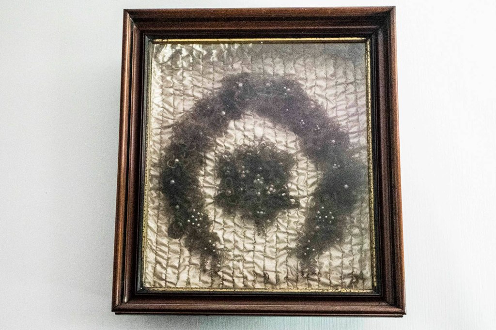 Takie „dzieła” jak na zdjęciu powyżej były tworzone z włosów ludzkich, i jak wytłumaczył nam przewodnik, każda rodzina chciała mieć jakąś pamiątkę po swoich przodkach, więc jeśli kogoś nie było stać na opłacenie fotografa czy malarza portrecisty wyrywał sobie kępy włosów i artystycznie wczepiał je w kawałek jedwabnego materiału……razem z kilkoma ozdobami. Po tym interesującym wykładzie przechodzimy na drugą stronę rzeki idąc krytym mostem Narrows Covered Bridge…