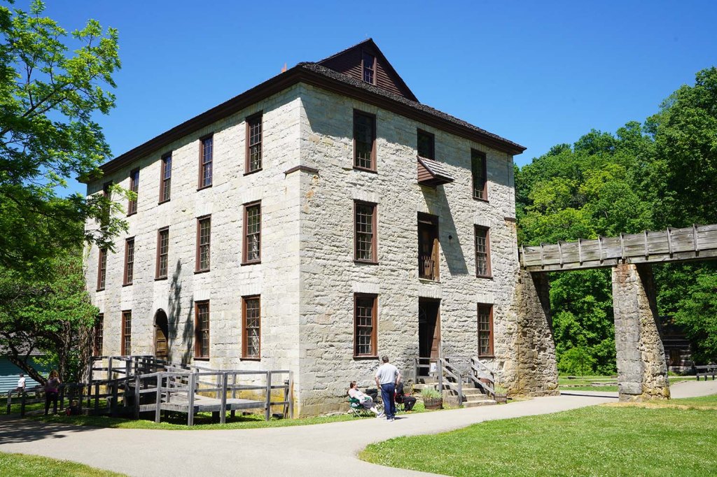 Jednym z ciekawszych (i zarazem najbardziej zatłoczonych) parków stanowych Indiany to Spring Mill State Park (3333 IN-60 E, Mitchell). Niewątpliwie najciekawszą jego częścią jest odrestaurowana wioska pionierska, której głównym „zabytkiem” jest trzypiętrowy młyn pochodzący z 1817 roku. Wokół młyna znajduje się 20 budynków m.in. gorzelnia, kuźnia, stodoły, spiżarnie, chatki mieszkalne, wokół których spacerują wolontariusze poprzebierani w stroje z XIX wieku. Wykonują oni różnego rodzaju prezentacje od kucia żelaza, po wyrób garnków, przędzenie wełny, gotowanie posiłków w kotłach nad ogniskiem itp. Podczas Memorial Weekend (ostatni weekend maja) rozgrywana jest tu inscenizacja bitwy z wojeny secesyjnej, w którą zaangażowane jest około 150 osób tworząc profesjonalnie zorganizowany półk piechoty i….. kilka strzelających przeraźliwie armat……