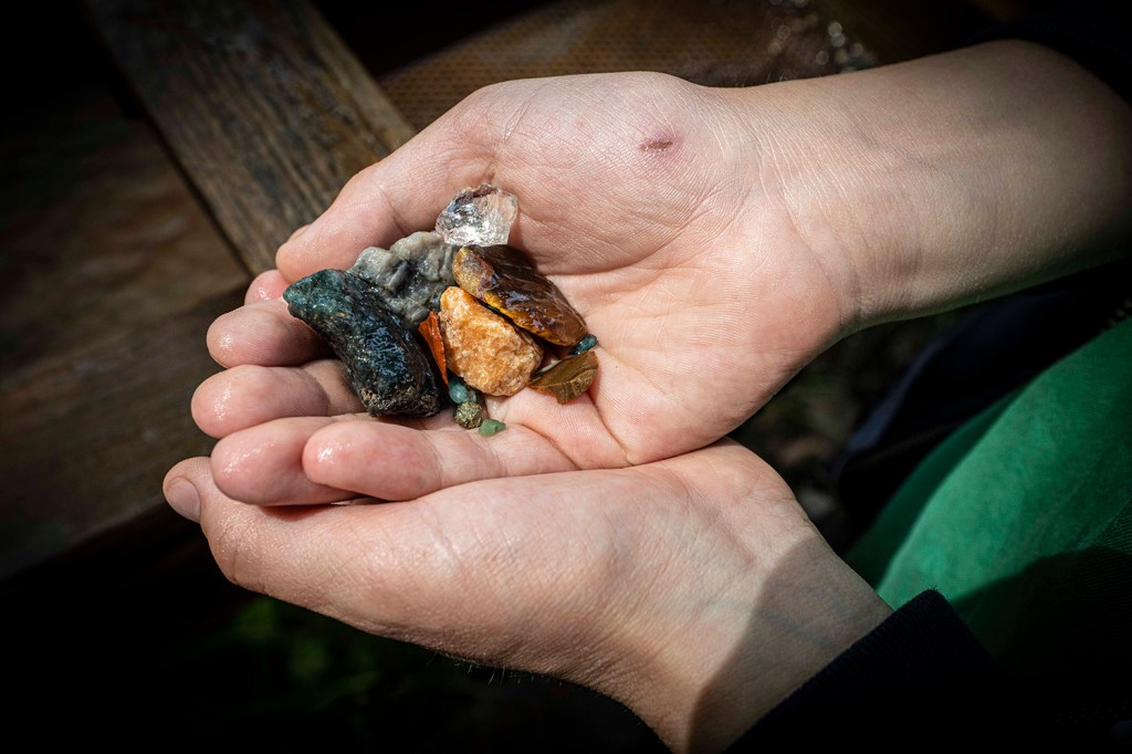 Skarby te następnie są zidentyfikowane na podstawie kartki ze zdjęciami tychże minerałów i schowane z powrotem do foliowego worka.