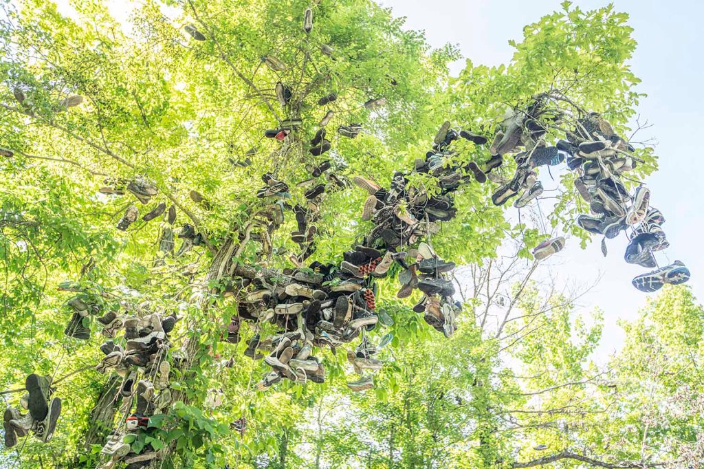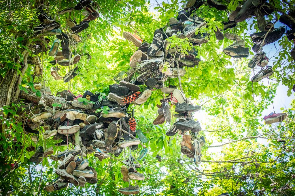 Dosyć dziwną atrakcją na naszej trasie jest Shoe Tree (w okolicy miasteczka Milltown), które ulokowane jest na totalnym bezludziu … Wśród gęstych zarośli na kilku drzewach pozawieszane są setki par butów….. a legenda głosi, że należy zarzucić swoją parę butów, żeby mieć w życiu szczęście 😊. Od nazwy tej „atrakcji” drogę, która przebiega tędy nazwano Shoe Tree Road!!!
