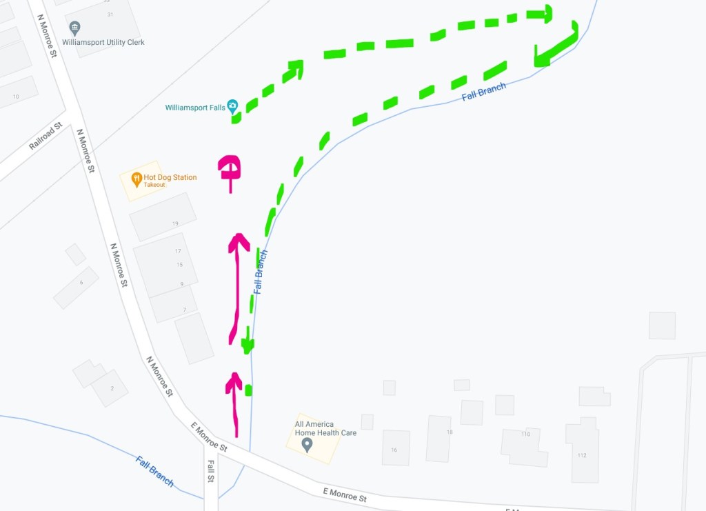W tym roku zbudowano tu nowy taras widokowy, ale nie daje on zbyt klarownego widoku wodospadu ze względu na przysłaniające go gałęzie drzew. Można zejść ścieżką dalej w dół i odbić na prawo do Fall Branch creek, dochodząc do wodospadu ścieżką poprowadzoną przy samej rzece, co jednak przy wysokim stanie wody może być trochę niebezpieczne.