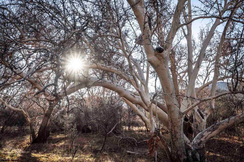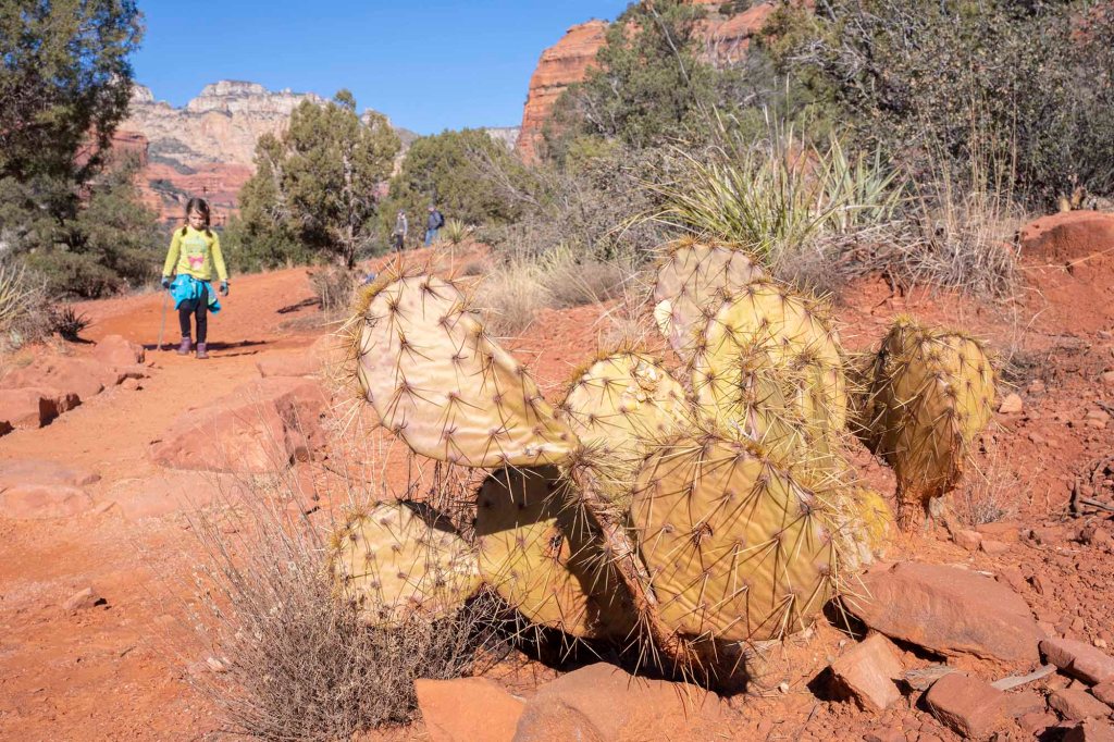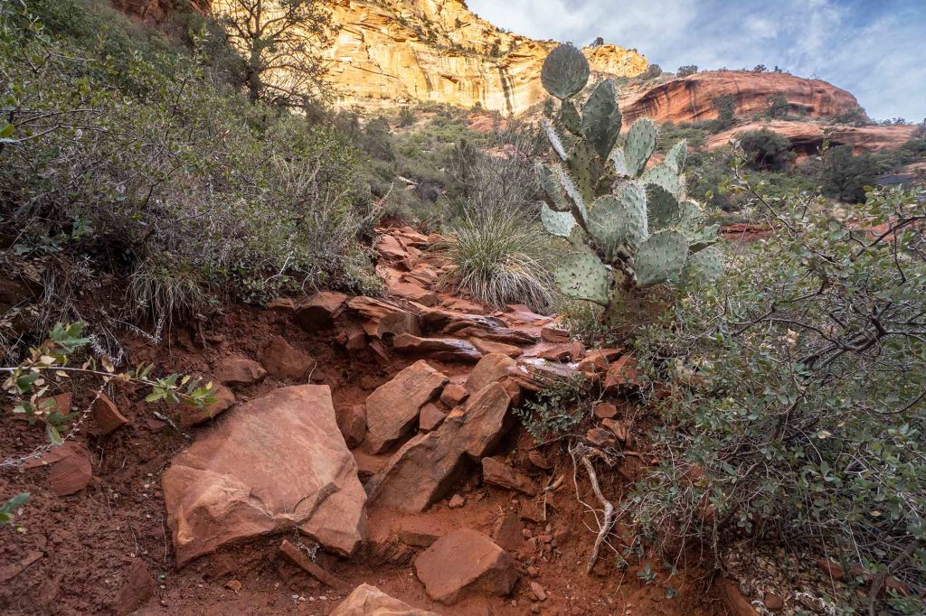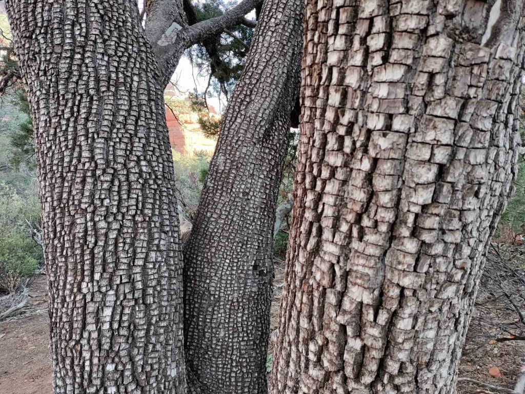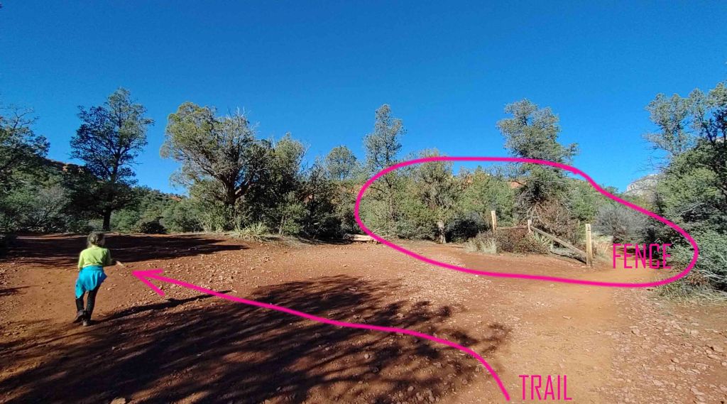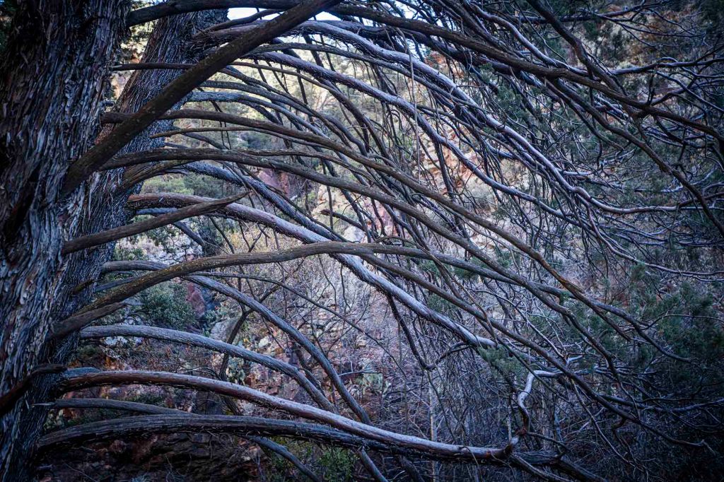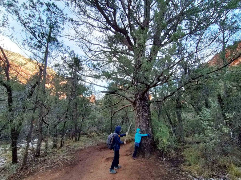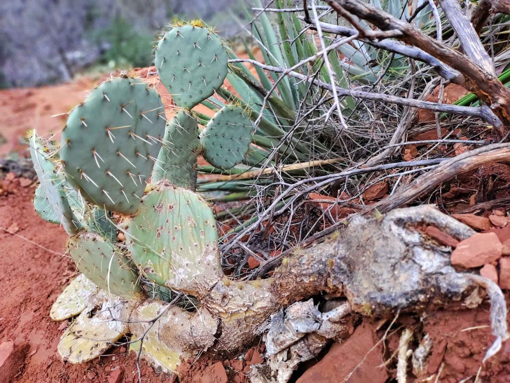 Stoi po lewej stronie (zdjęcie zrobione w czasie drogi powrotnej….) i jak tylko je zobaczymy musimy odbić w prawo (nie ma żadnego kierunkowskazu). Drzewo to stoi mniej więcej 2 mile od wyjścia na szlak. (Chodzi tędy tak dużo ludzi, że na pewno ktoś nam pomoże wskazać odpowiedni kierunek jeśli będziemy mieli wątpliwości). Jeśli pójdziemy za daleko to od razu zorientujemy się, że coś jest nie tak… roślinność drastycznie się zmieni i otoczeni zostaniemy wysokimi sosnami… Jeszcze przed dojściem do aligator tree wchodzimy w cień rzucany przez pasmo górskie (należące do Red Rock Secret Muntain Wilderness) co oznacza znacznie niższą temperaturę otoczenia. Po skręcie w prawo ścieżka znacznie się zwęża i po przejściu suchego koryta rzecznego – dry wash – wznosimy się już stromo do góry. Idziemy teraz głównie w otoczeniu kaktusów prickly pear, juk i agaw.