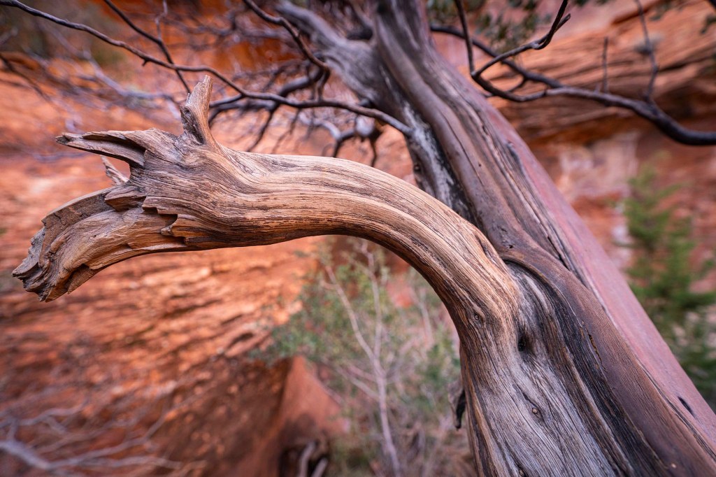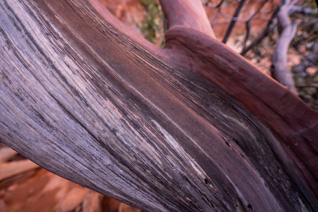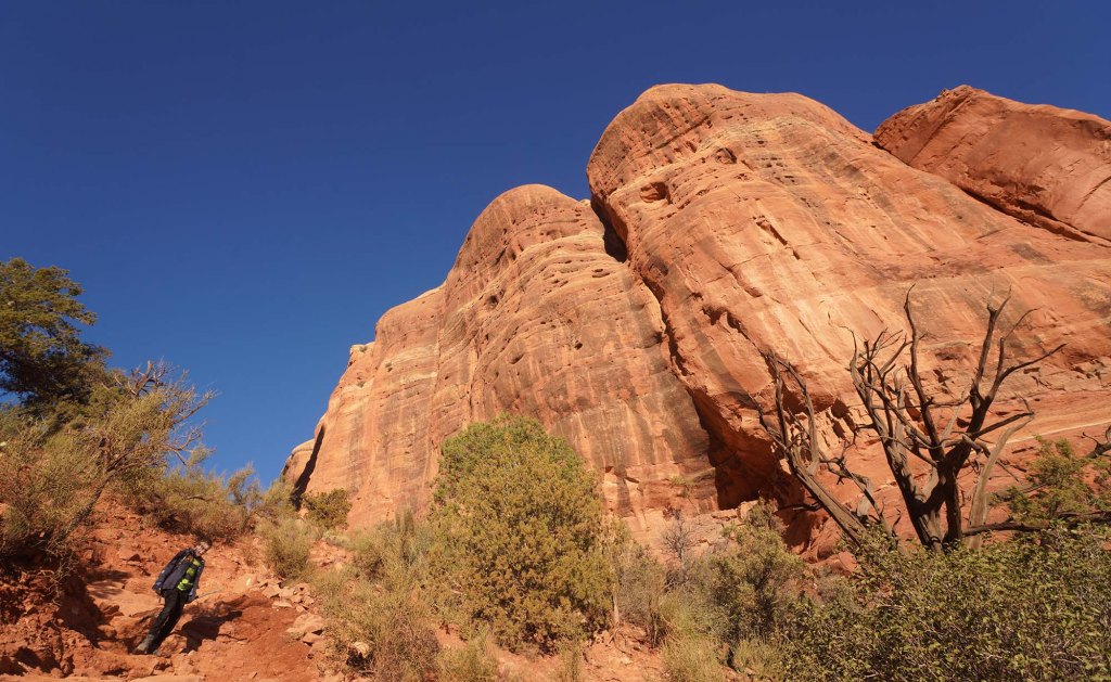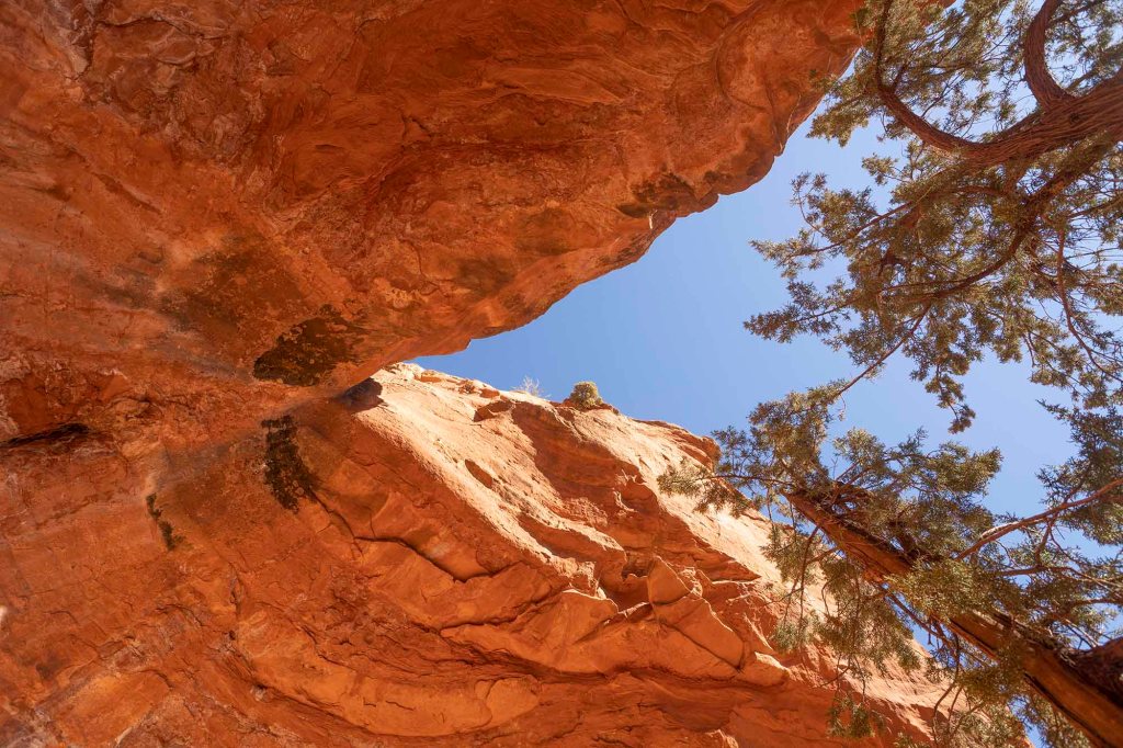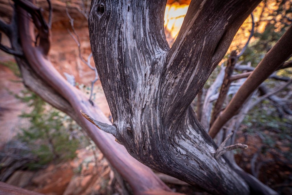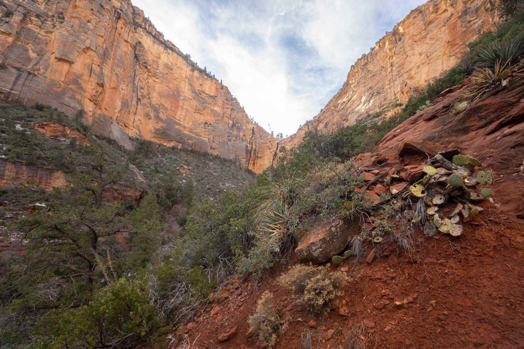Idziemy dość szeroką ścieżką pośród czerwonych piaskowców i bujnej krzaczastej roślinności, początkowo wzdłuż zabudowań resortu. Temperatura na przewidziana na dzisiaj to maksymalnie 12°C, ale wędrując po otwartej przestrzeni w silnie grzejącym słońcu ma się wrażenie jakby było z pewnością ponad 25°C. Dla chcących „złapać” najlepsze fotograficzne światło w jaskini Subway najbardziej korzystnym czasem jest środek dnia i popołudnie. Rano słońce zdecydowanie nie sprzyja w robieniu zdjęć świecąc prosto w obiektyw aparatu. Idąc ścieżką rozglądamy się za aligator juniper tree, służacej jako drogowskaz do odejścia od Boynton trail w kierunku jaskini.