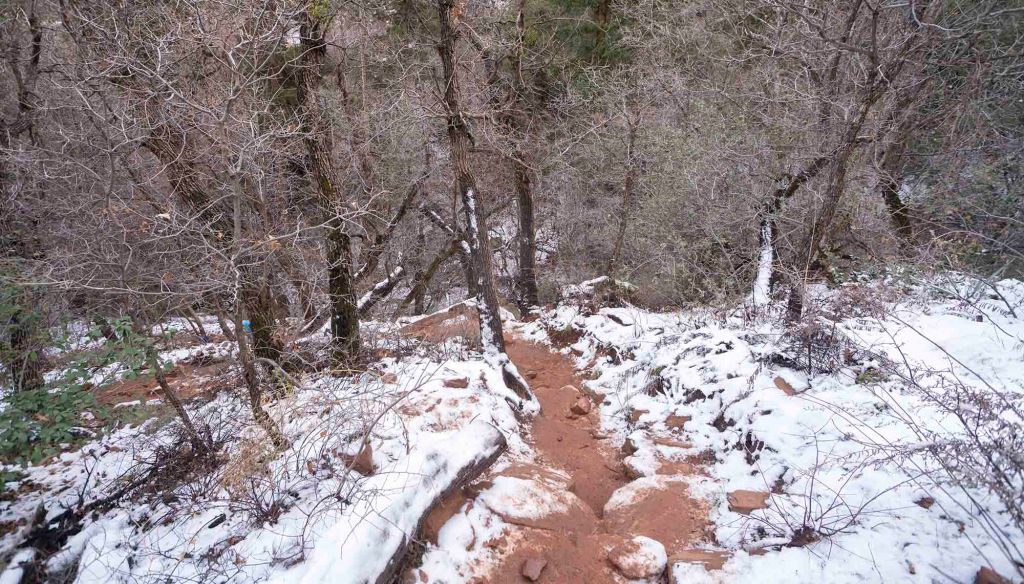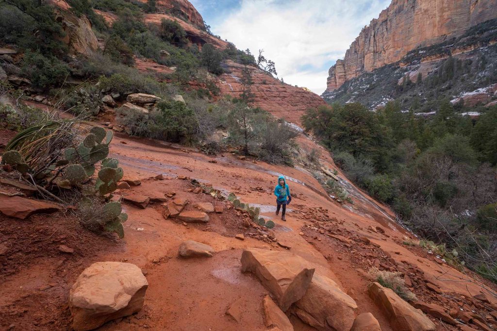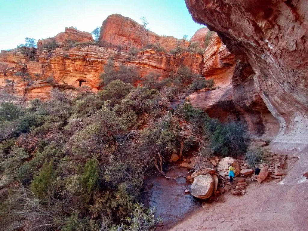 Spotykamy tu tylko 3 osoby, z czego jasno wynika ze olbrzymia większość ludzi tu przybywających wybiera tylko Subway cave, po którego „zaliczeniu” wraca na parking. Dzięki temu spacer w tej cześci szlaku jest bardzo przyjemny i można w końcu w spokoju (poza wrzaskami własnych dzieci) nacieszyć się cudowności przyrody. Las tu pachnie… pomimo zimowej pory… a może to rozpierająca radość, że znowu jesteśmy otoczeni przyrodą sprawia, że nasze zmysły węchu są nadmiernie pobudzone….😊 Końcówka szlaku jest bardzo stroma …. Skały są tu bardzo śliskie i niestabilne…. z gliniastym lepkim podłożem.